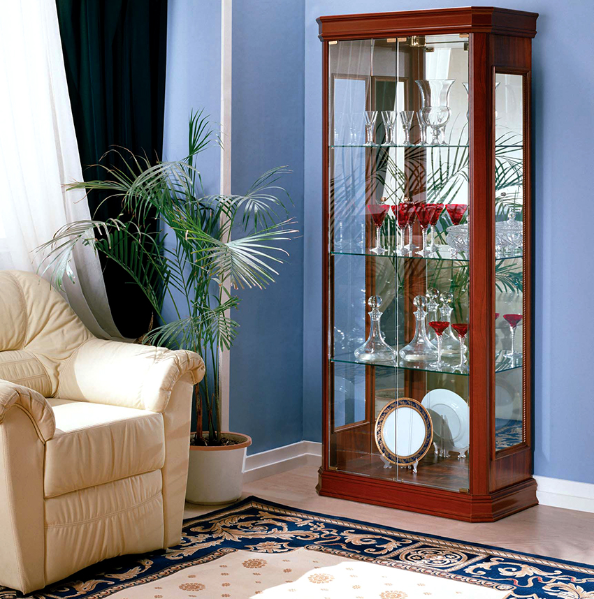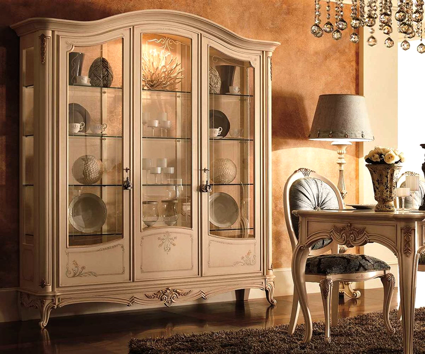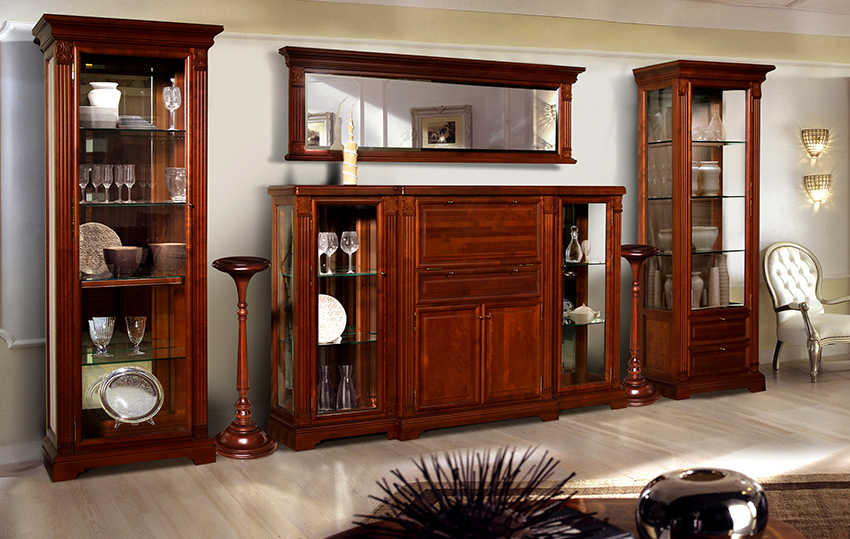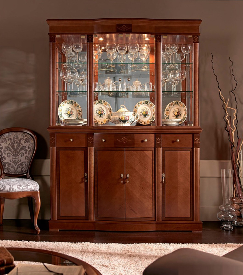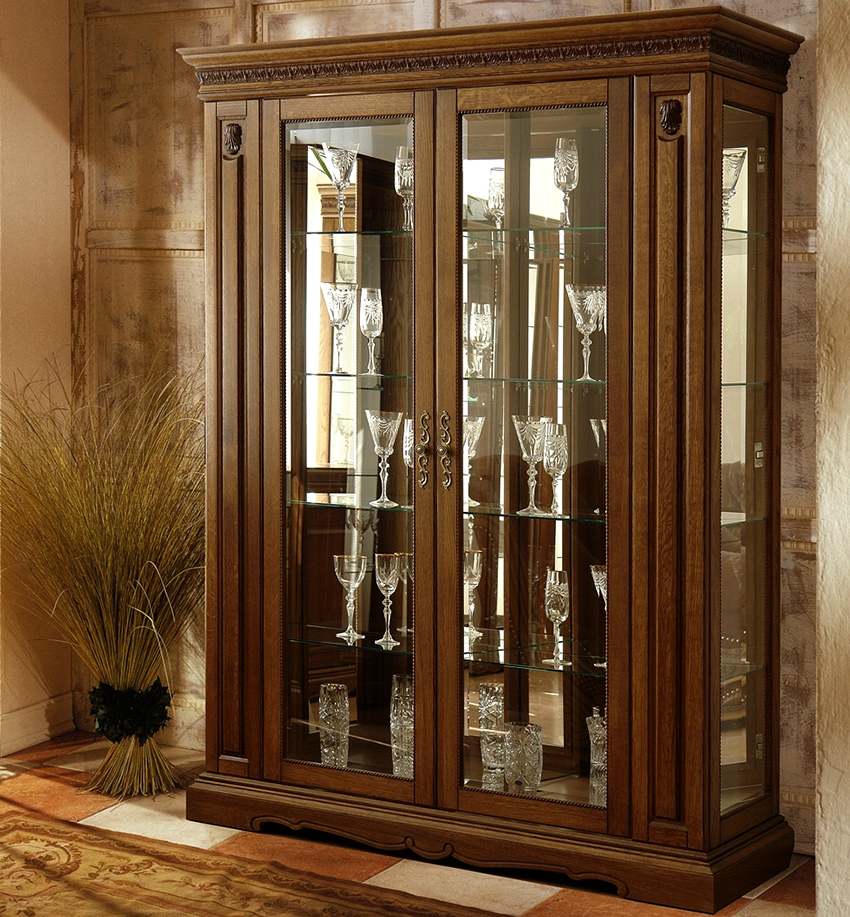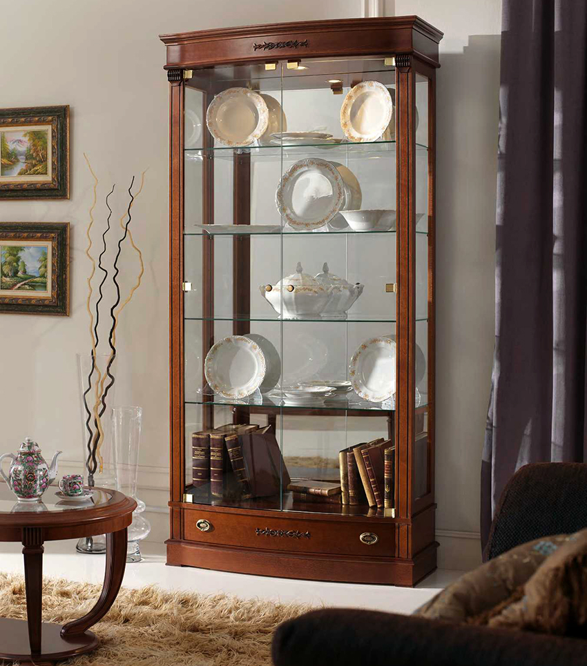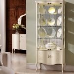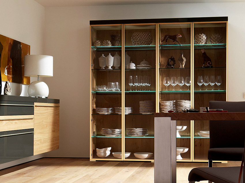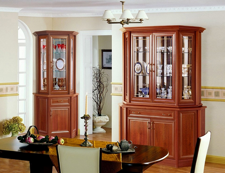 Unlike classic cupboards for dishes, display cabinets are necessarily equipped with glass, moreover, they have not only glass doors, but also shelves. In this case, the glass is made using a special technology, amenable to special tempering, since it must withstand the weight of heavy crystal and porcelain.