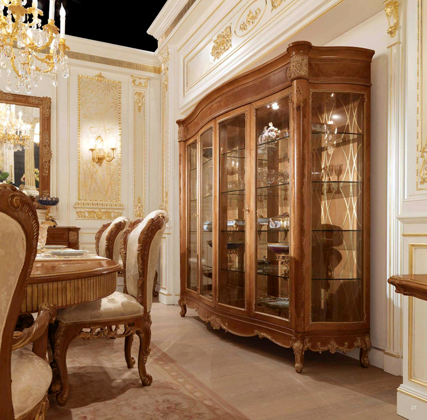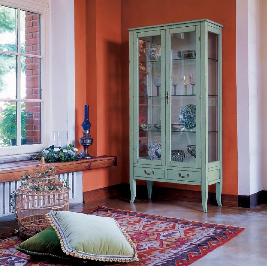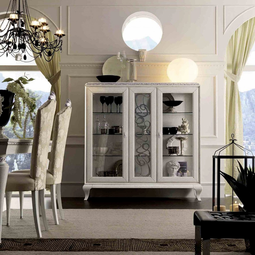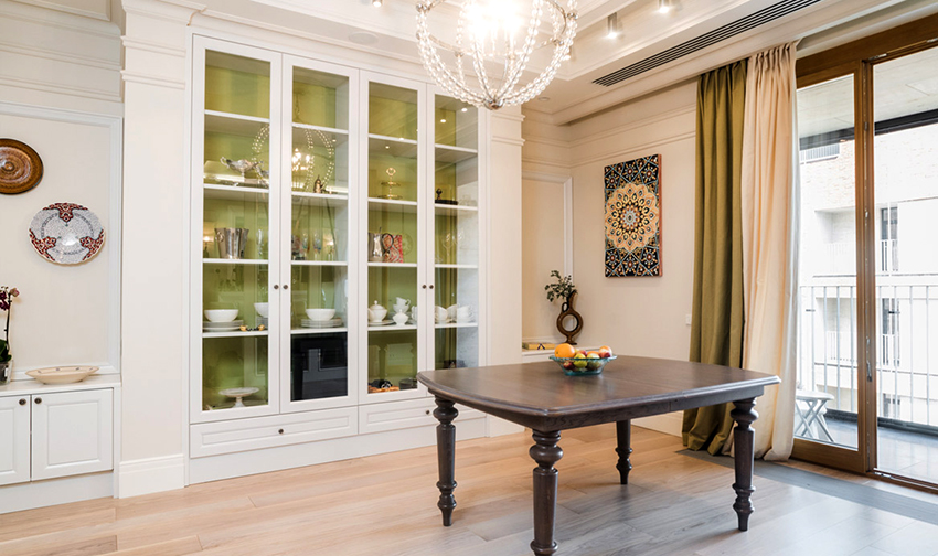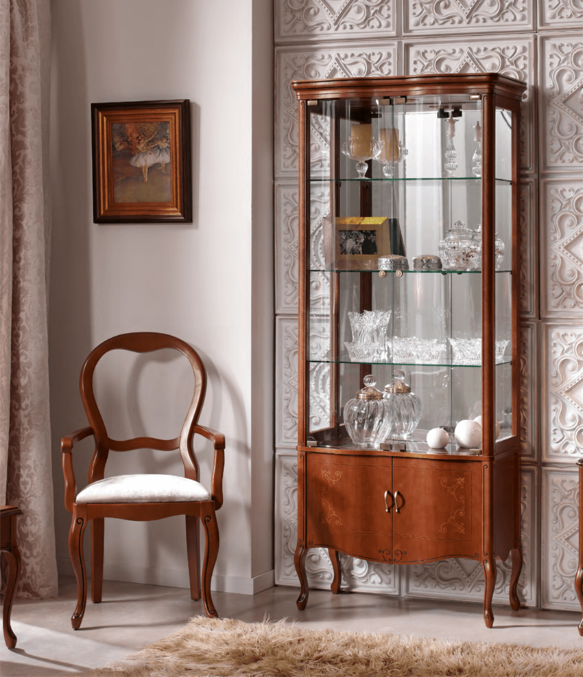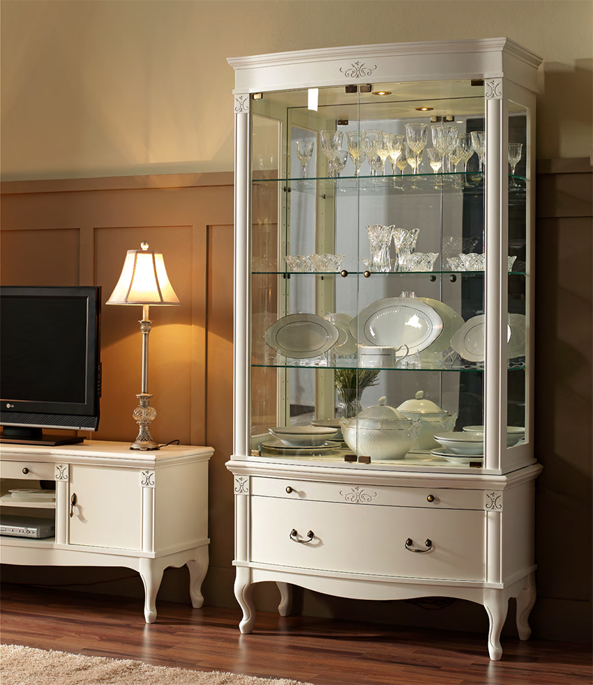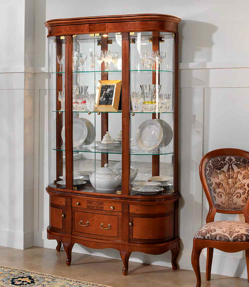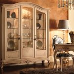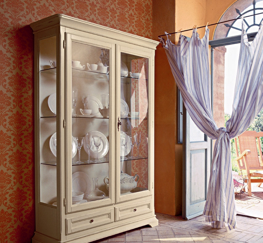 Unlike classic cupboards for dishes, display cabinets are necessarily equipped with glass, moreover, they have not only glass doors, but also shelves. In this case, the glass is made using a special technology, amenable to special tempering, since it must withstand the weight of heavy crystal and porcelain.
