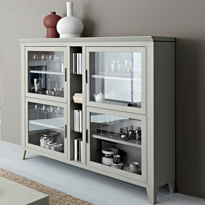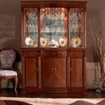 The display cabinet for dishes is equipped not only with glass doors, but also with shelves. Often, these sideboards are equipped with lighting, which emphasizes the beauty of fine tableware. Souvenirs, figurines and other decorative items are often kept in such lockers.