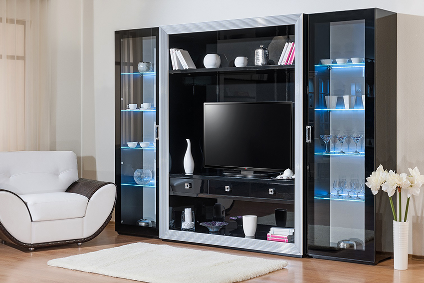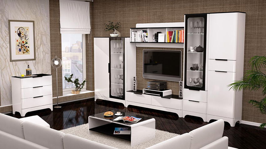 The slide wall owes its name to its structural characteristics. All furniture elements in the form of drawers, cabinets and shelves during the assembly process are installed according to the principle from larger to smaller, forming a slide. The shape of the top of the structure is not even, but smoothly falling in the form of steps - without sharp transitions. The cabinet-slide, first of all, has smaller dimensions in comparison with the classic sideboard for dishes in the living room. Photos show the compactness of this type of furniture with a relatively large capacity.