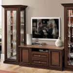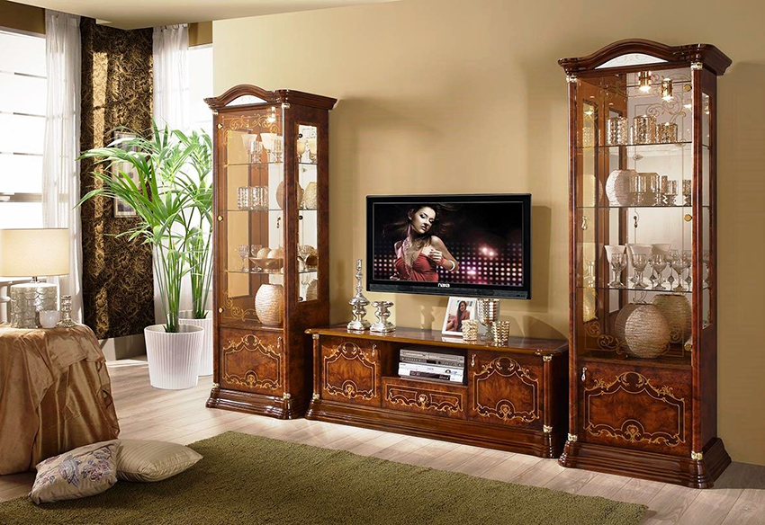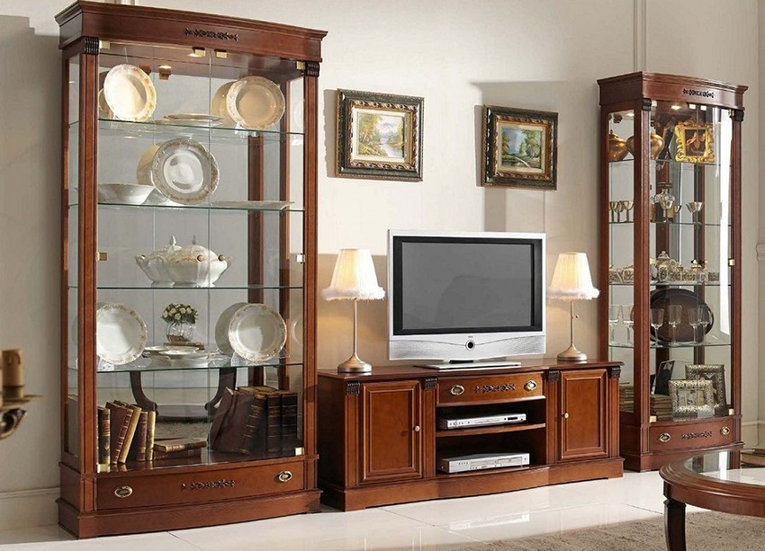 The main feature of the display cabinet for dishes in the living room is decorativeness. In such a sideboard, only everything that is most expensive and beautiful is located - what is the property and pride of the family. At the same time, valuable items are protected from dust thanks to glass doors. The showcase is used for storing porcelain sets, elite crystal, bohemian glass, various souvenirs, gifts, even jewelry and elite alcohol. In addition, the shelves can be used to house collectible items and photographs.