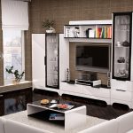 Corner slides suggest the presence of a corner cabinet in the headset, which, as a rule, is located in the middle of the overall structure. Other cabinets are installed radially along adjacent walls. Such headsets are placed in spacious living rooms with a square shape.