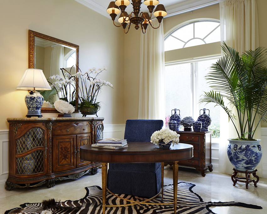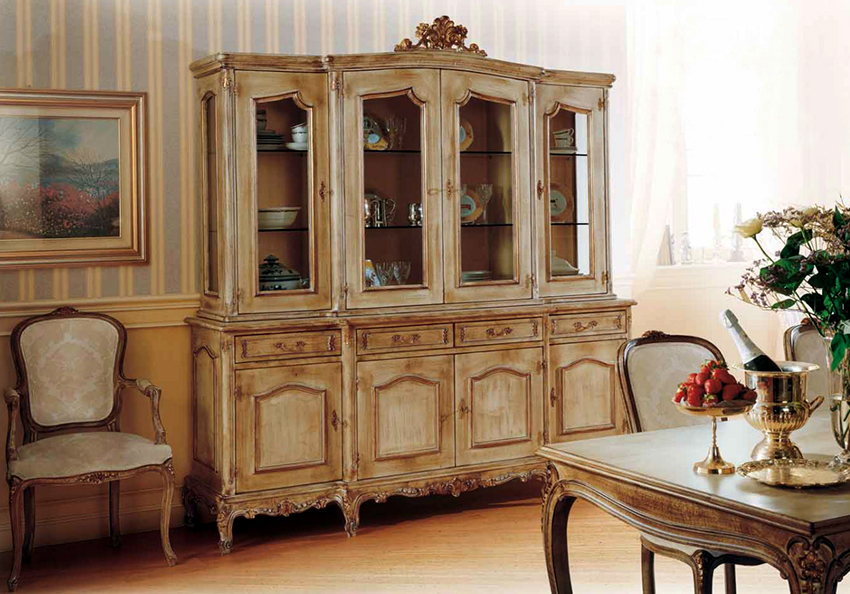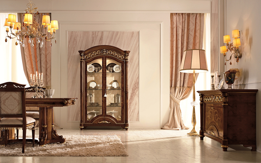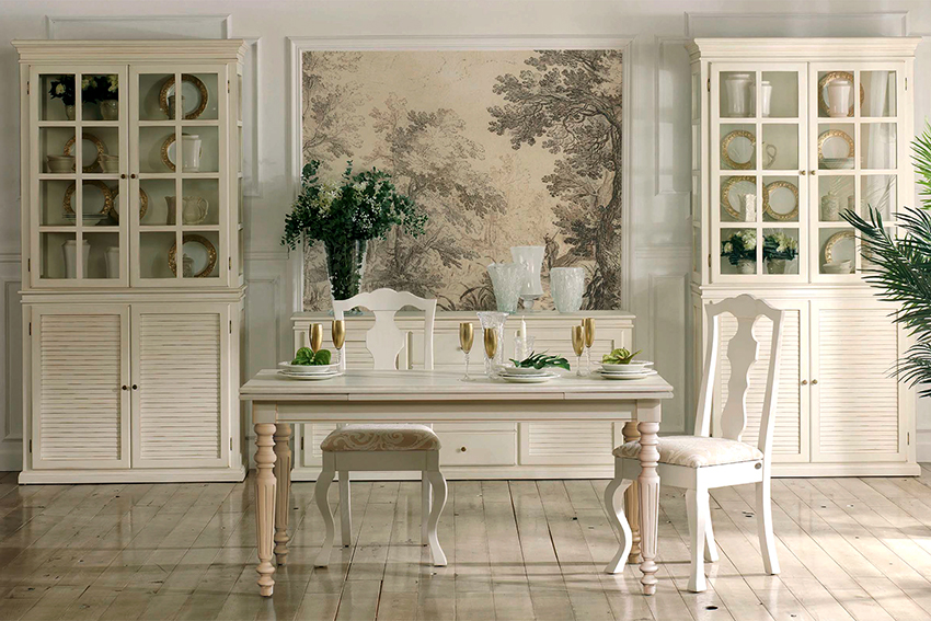 Classic furniture is austere bulky forms and precious woods. In palace styles such as baroque and rococo, the presence of natural material, elements of carving, gilding, stones and carved legs is mandatory. For these styles, as well as for country and Provence, the presence of vintage elements is characteristic, decoupage and hand-painted decorations are used.