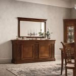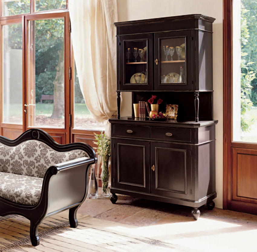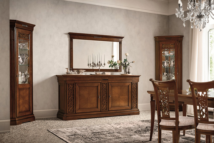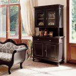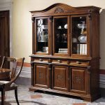 The classic model is used for storing dishes. It has a large number of shelves and two compartments, where the upper part is shelves with glass doors, and the lower one is a cabinet with blind doors. These models, as a rule, are made from valuable wood species, but there are also cabinets made of MDF or chipboard. Such furniture is distinguished by its expensive and chic look. A classic sideboard necessarily assumes the presence of legs.