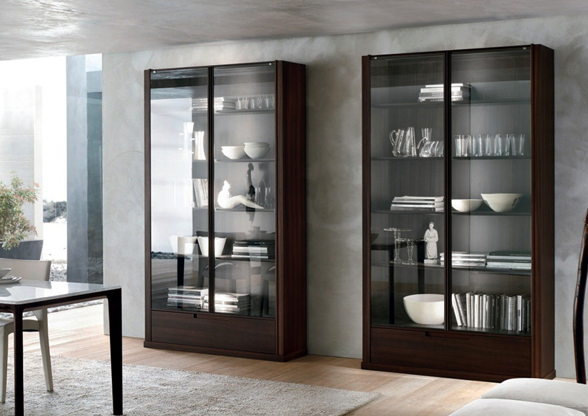 By the type and number of doors in the wardrobe, display cabinets can be single-door, double-leaf and sliding, where the doors work on the principle of a sliding wardrobe. Actually, the arrangement of display cabinets can be very diverse. The following basic structures are distinguished:
