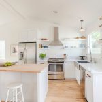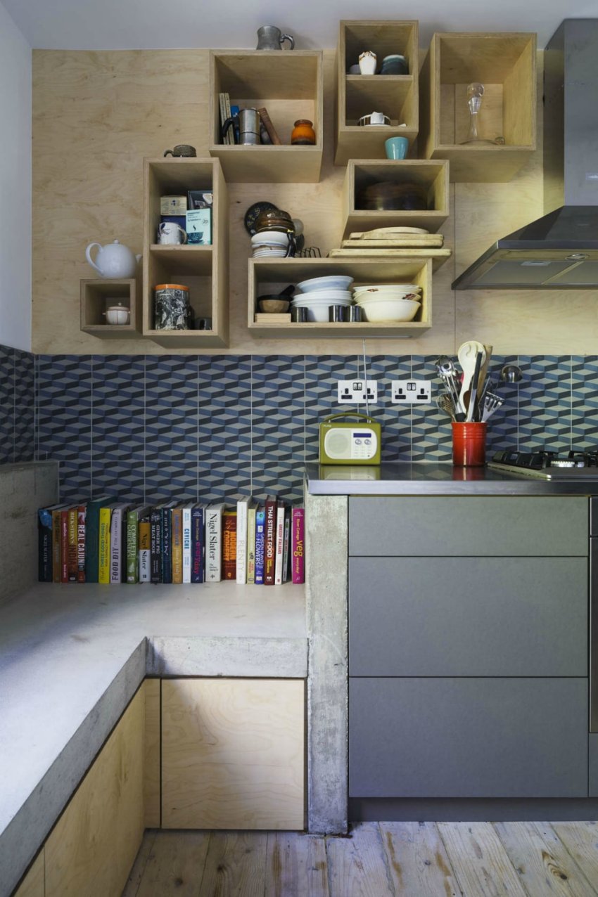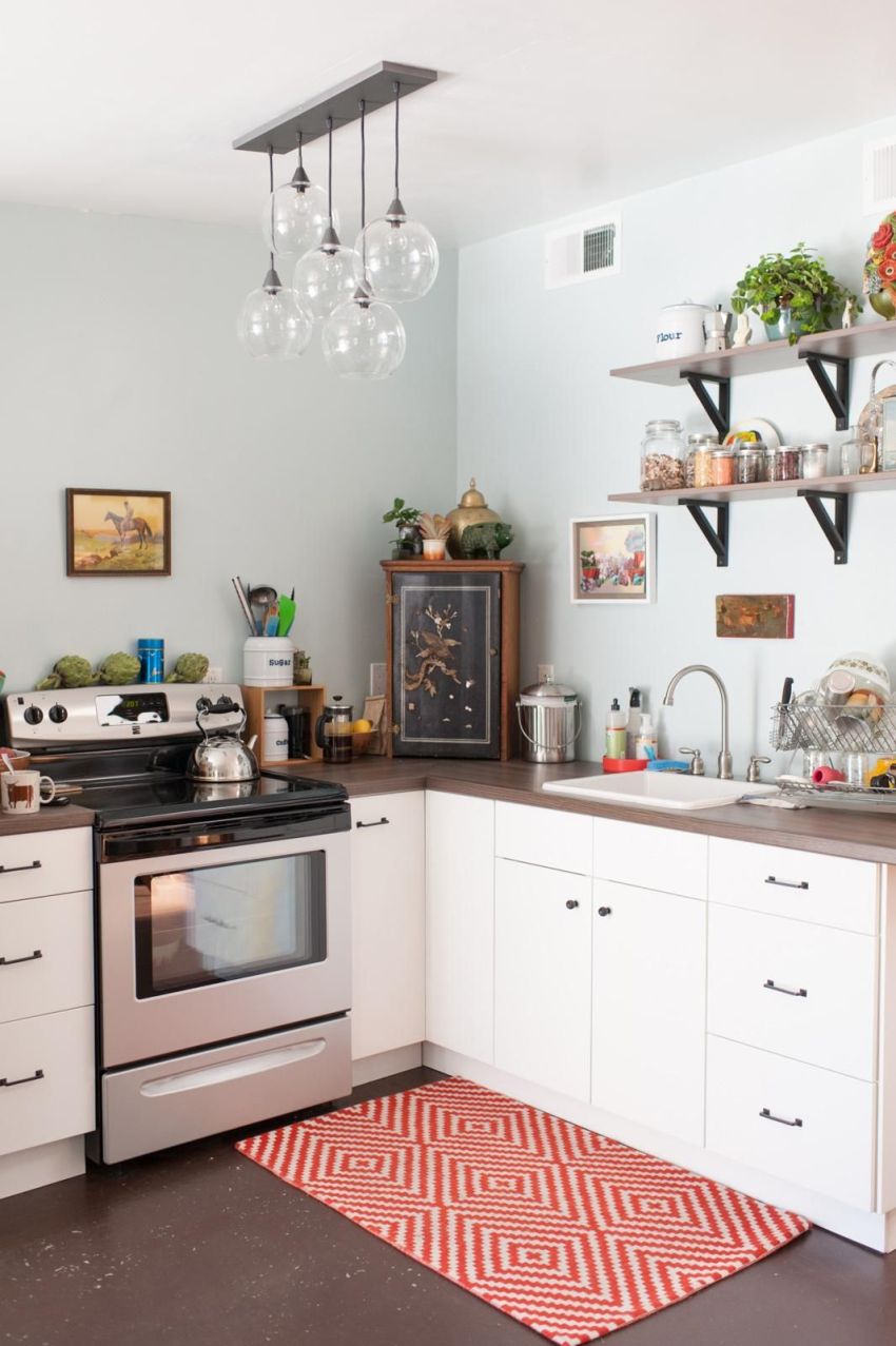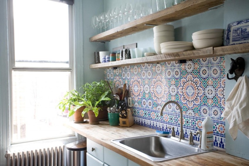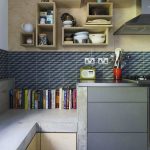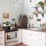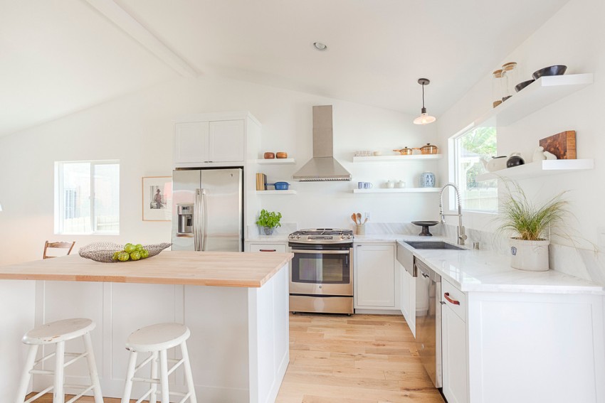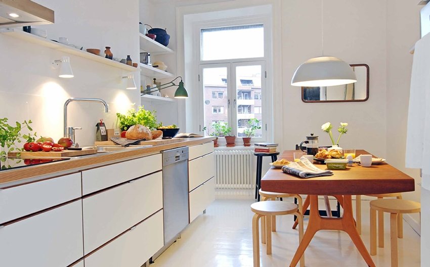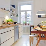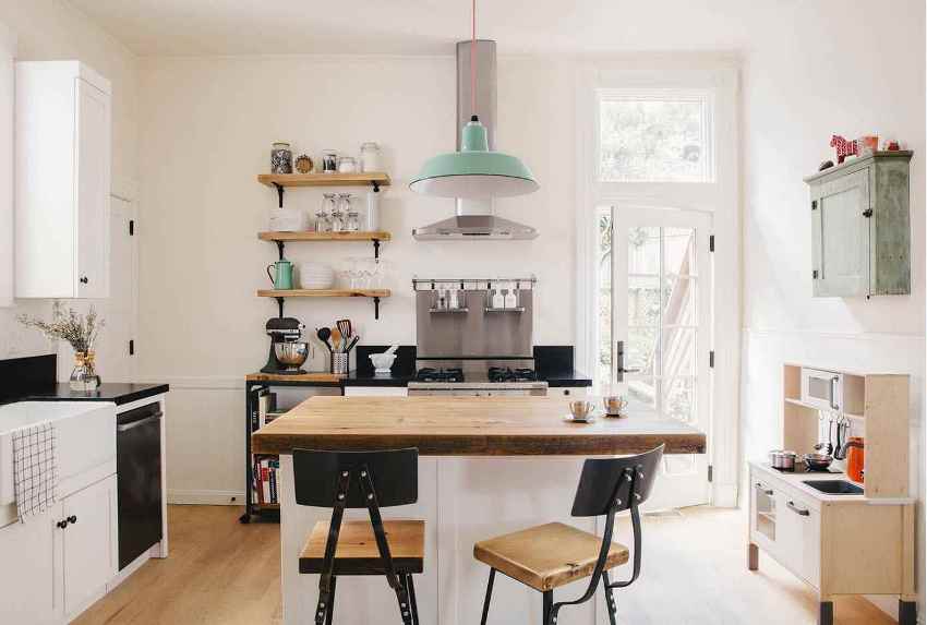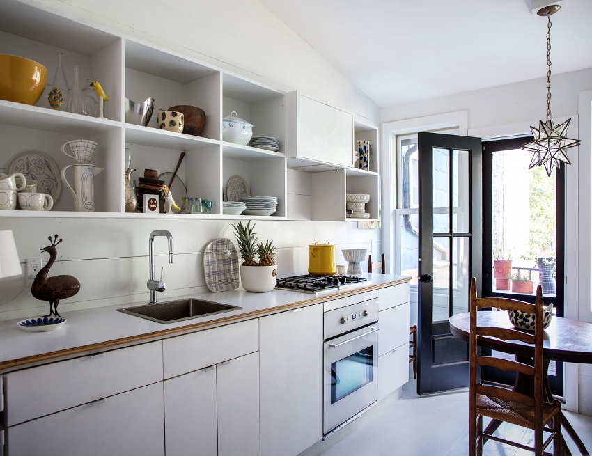 In order not to clutter up the space of a small kitchen, instead of hanging cabinets, you can equip open light shelves
