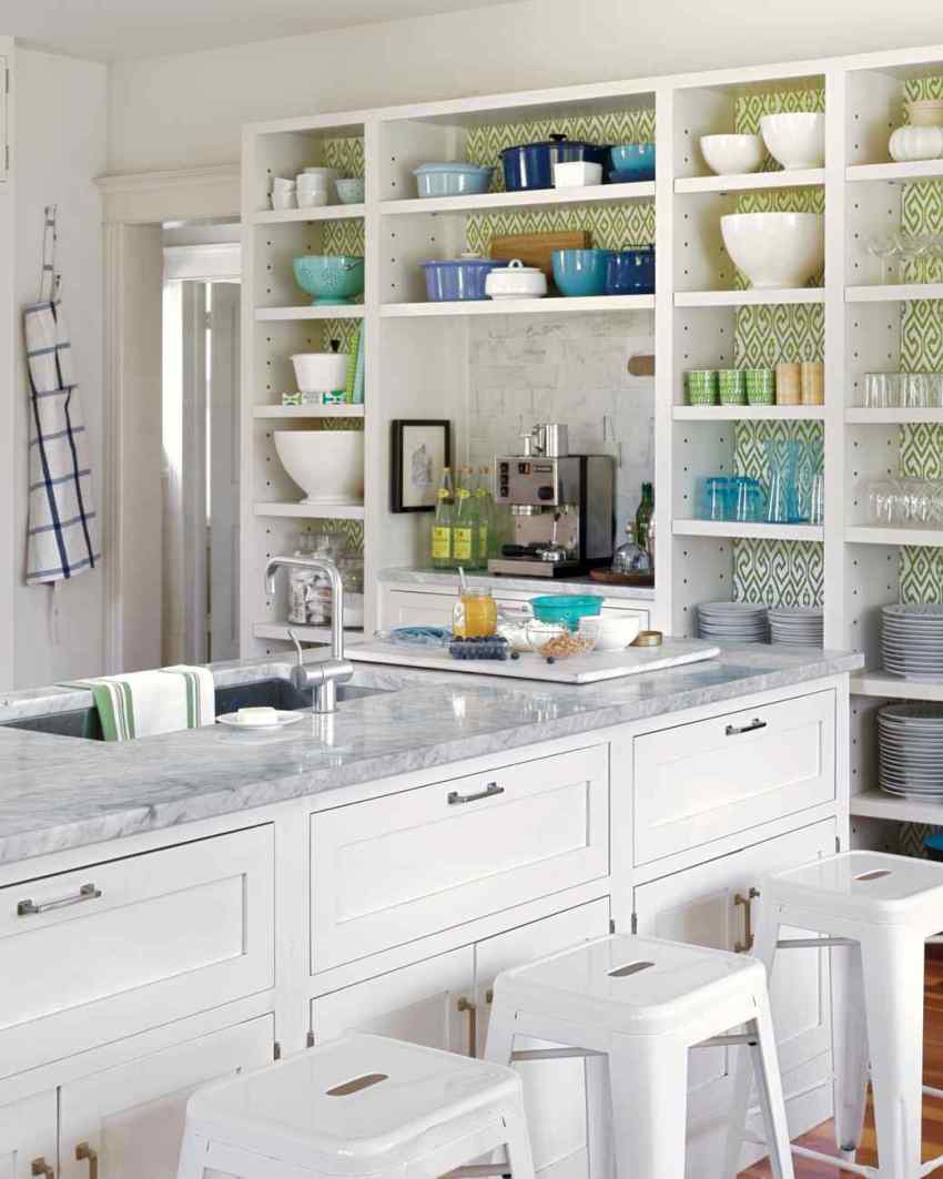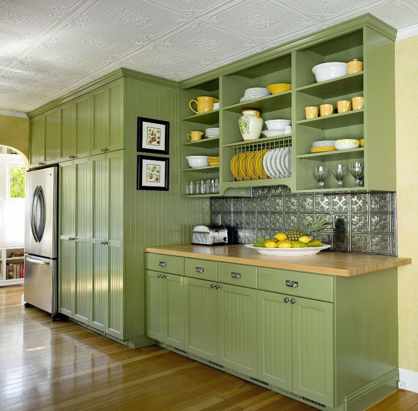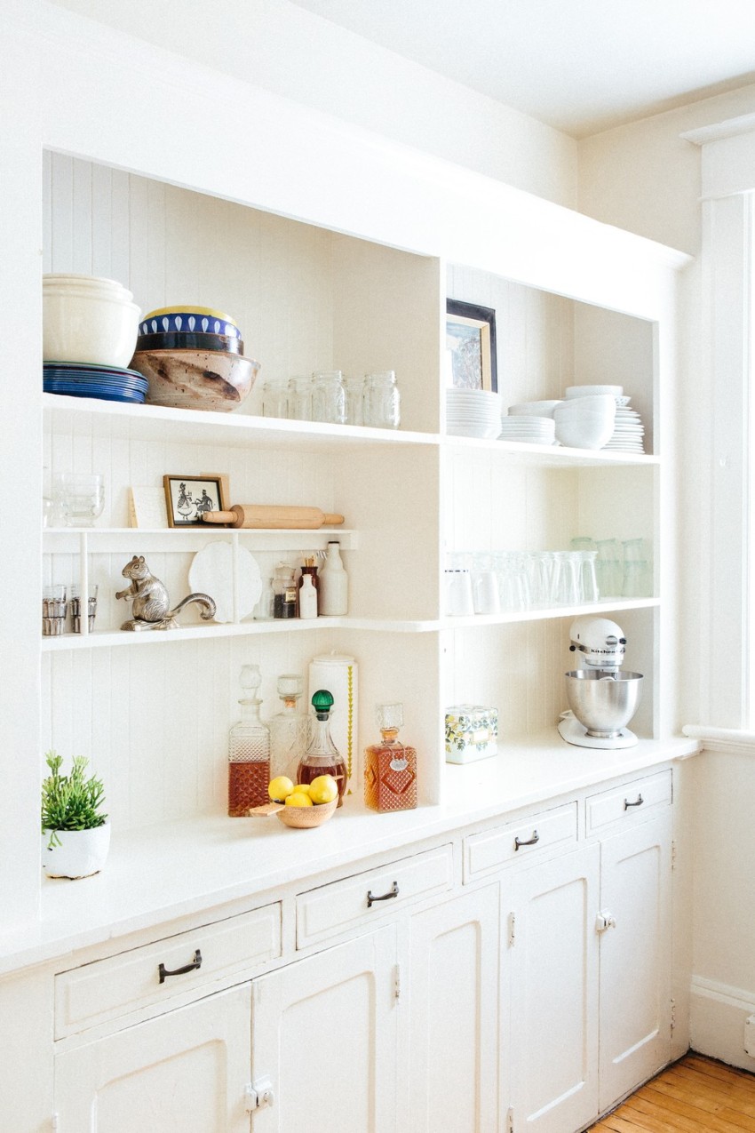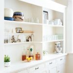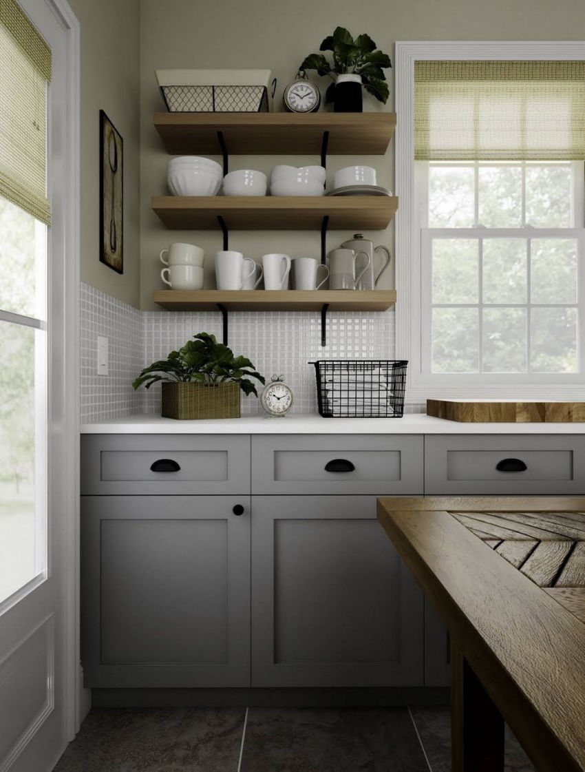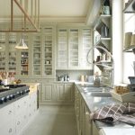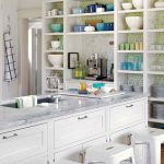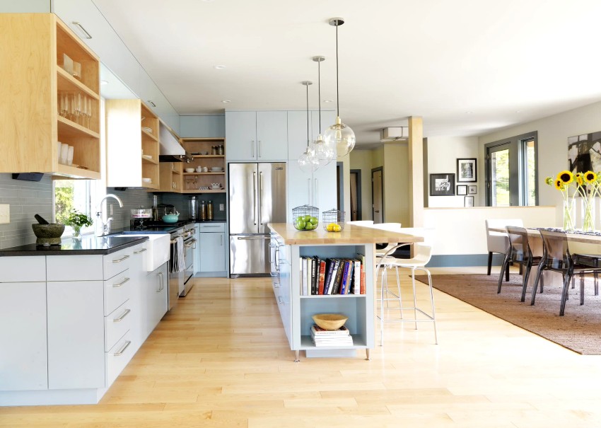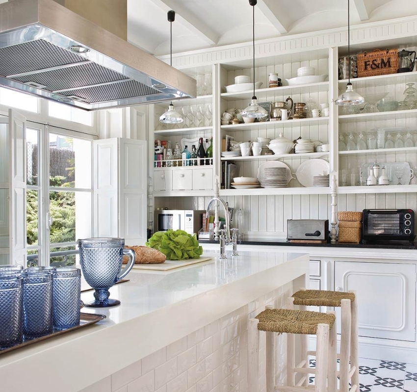 Open shelves in the kitchen are very convenient, since in order to reach any object, you do not need to open and hold the door. Here you can store containers with spices, cutlery in the form of spatulas, slotted spoon, glasses and decor items. The main disadvantage of such shelves is that they are not very spacious, and the items located on them require constant and careful care.