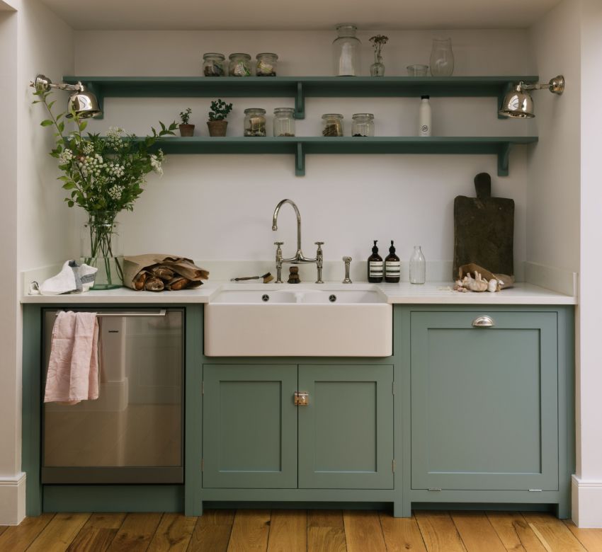 Kitchen cupboards usually have two parts - the upper one (with open shelves) and the lower one (with blind doors)