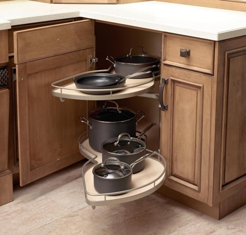 The kitchen carousel is a shelf that rotates in a circle, which allows efficient use of space in corner cabinets. This design involves the placement of even large items such as pots and pans.