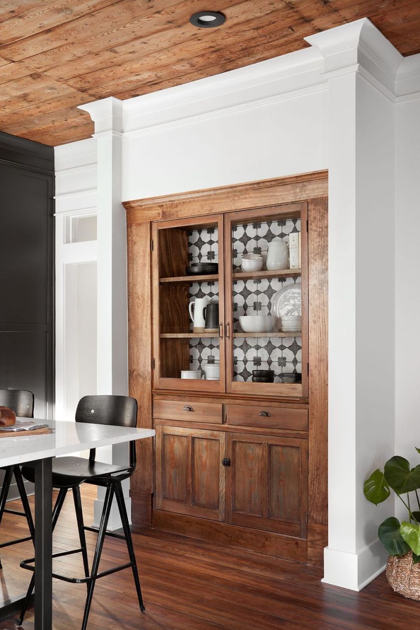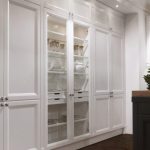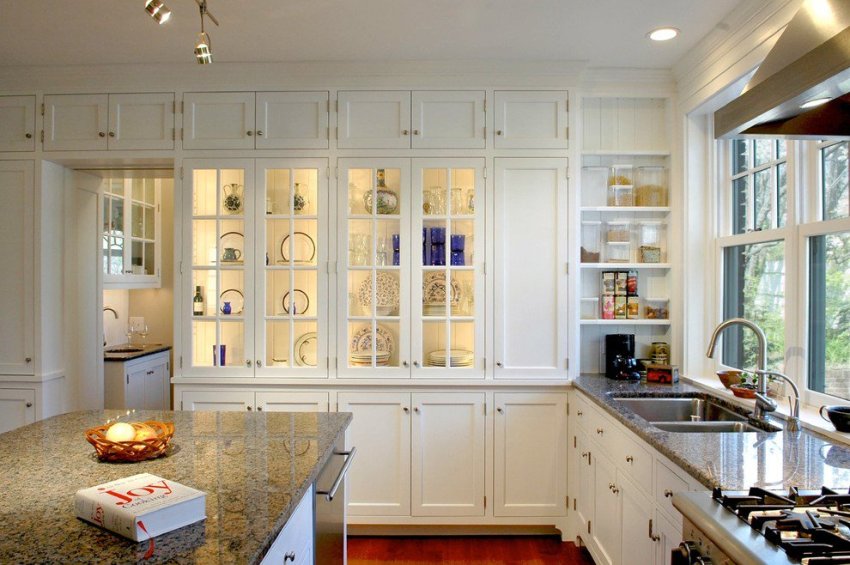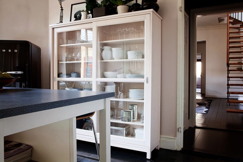 Cabinets with glass inserts allow you to quickly find the desired item and protect the dishes from dust