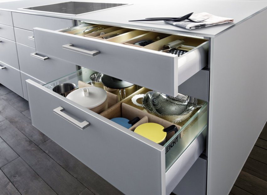 The convenient and perfect mechanism, which the drawers are equipped with, makes it possible to smoothly slide them out and in, even with the maximum load of items. The railing systems have special attachments with hooks designed to place potholders, ladles, skimmers and other kitchen utensils on them. They, like the storage device for plastic lids, are placed inside the cabinets or outside - on the kitchen wall.