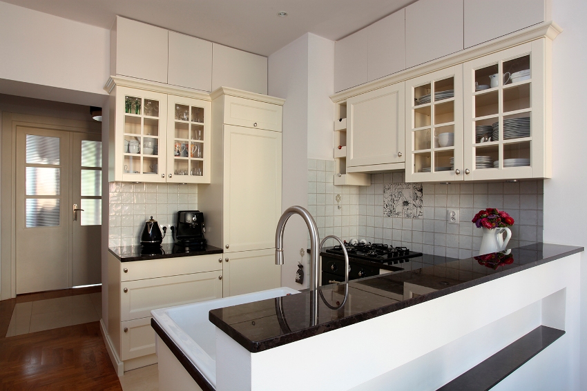 Kitchen cabinets are often complemented by different types of glass. Sometimes there are pure glass models. At the same time, it is important that the material from which the kitchen cupboards are made match the other furniture present in the room.