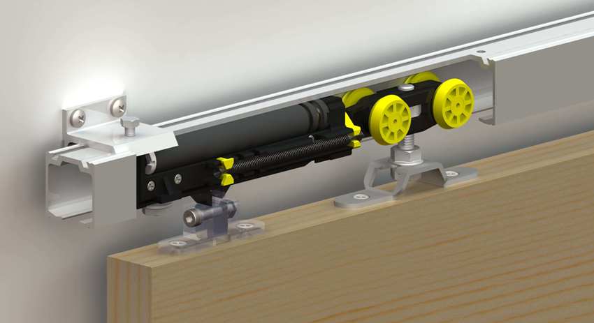 The hitch is the only option with a top profile. It makes an unpleasant sound, and is also not very stable. To move the flaps, you need to make some effort. There is only a top version that can be fixed to the ceiling. It should not be used for the bedroom. The suspension mechanism consists of two guides and is fixed to the frame from the inside. The load is distributed approximately in half, thus causing the door to skew.