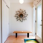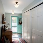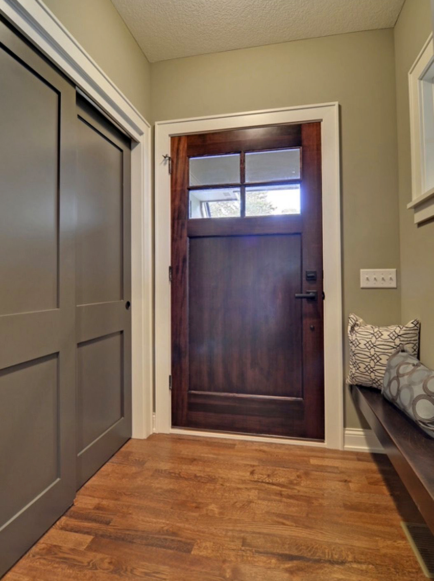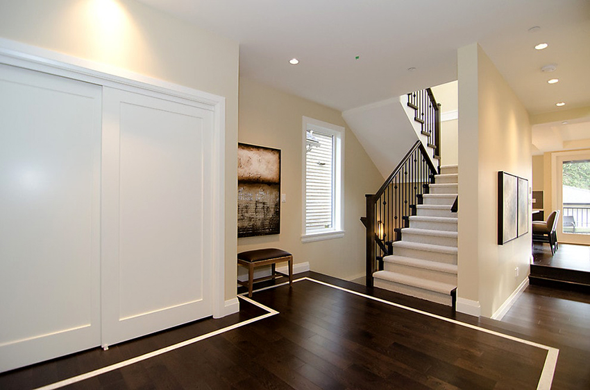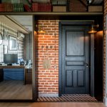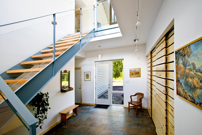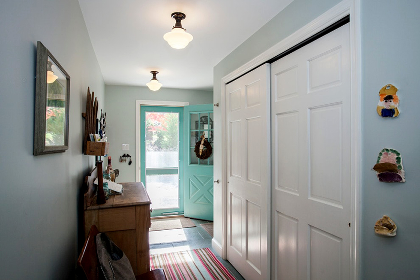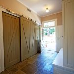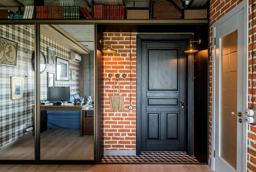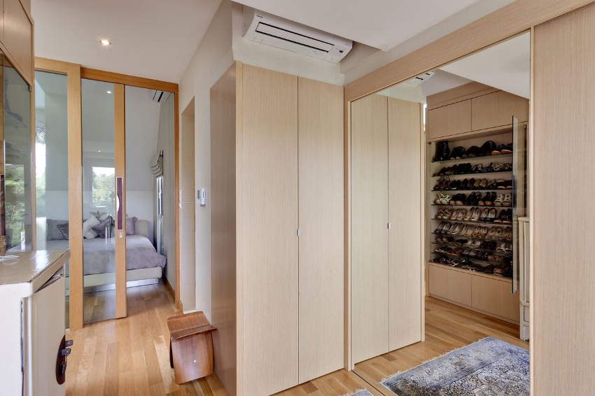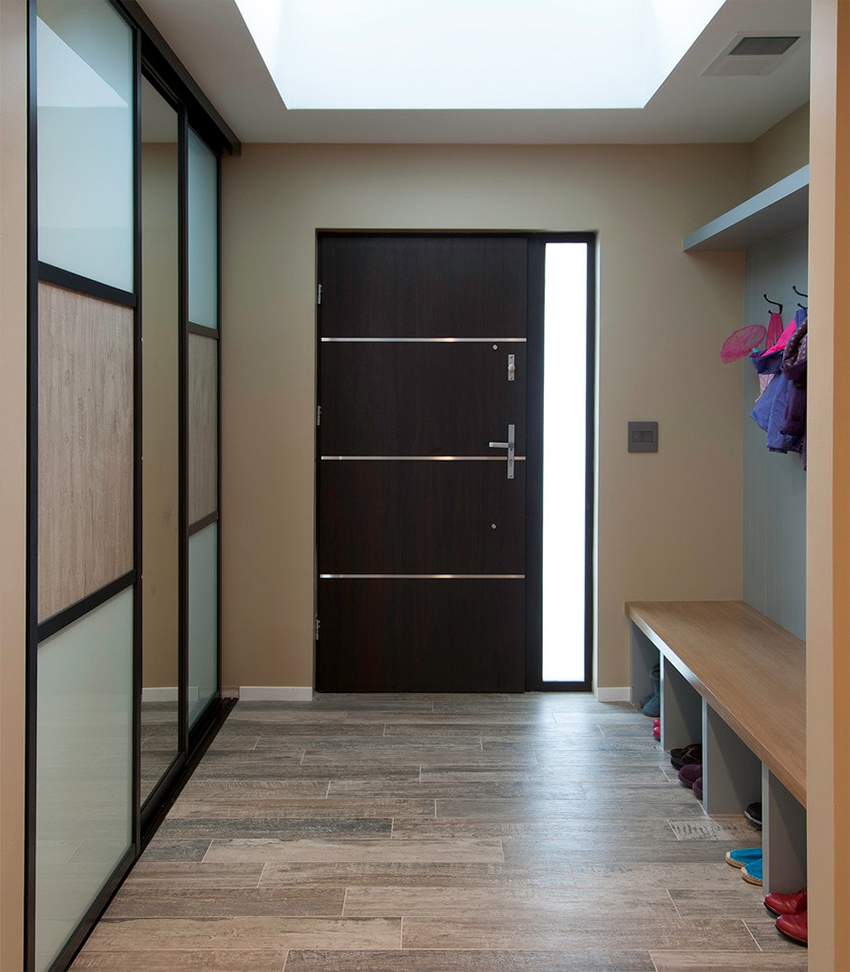 The panel-to-panel construction has side walls. This is a good option for a room with two exits located on the same plane. If the front door is in the middle of the wall, the most appropriate option for rational use of free space is a model with a mezzanine above the opening. The wardrobe frames the door along the perimeter, making it a highlight of the interior.