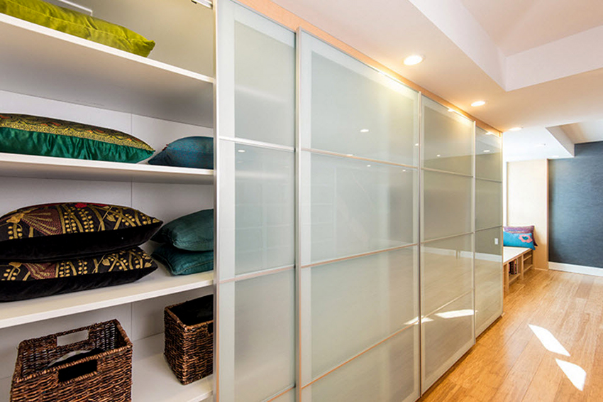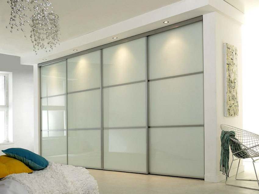 To create the effect of translucency, while hiding the contents of the wardrobe, you can use a lacquer facade. This material is frosted glass, which is obtained by etching with hydrofluoric acid. Despite the fact that the product is 4 mm thick, the material is durable and practical. This surface does not need special care.