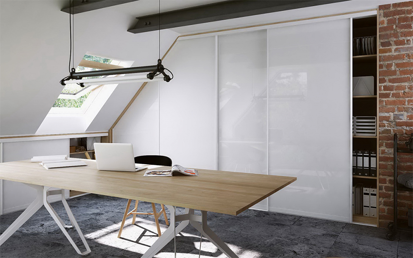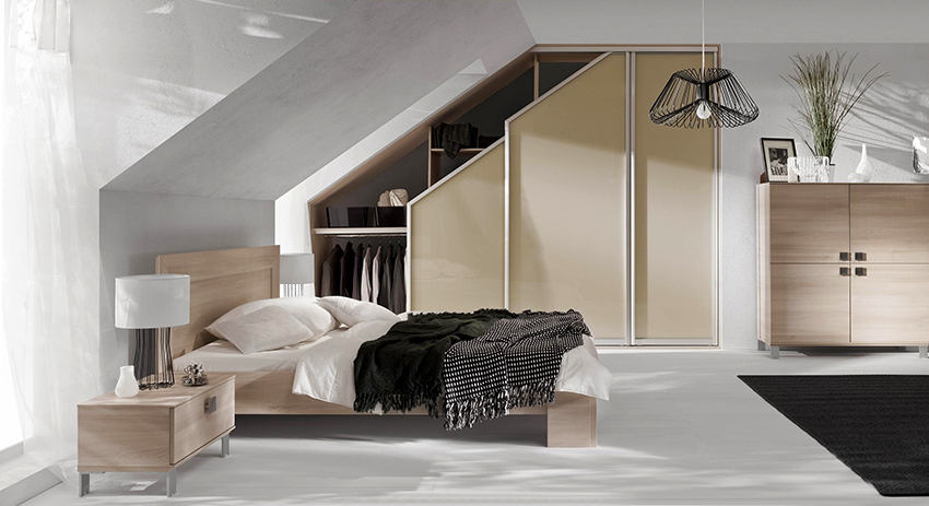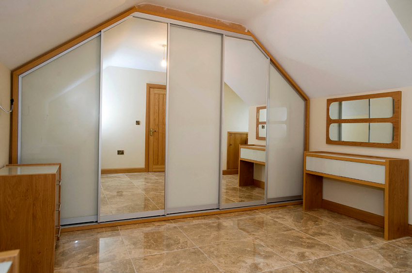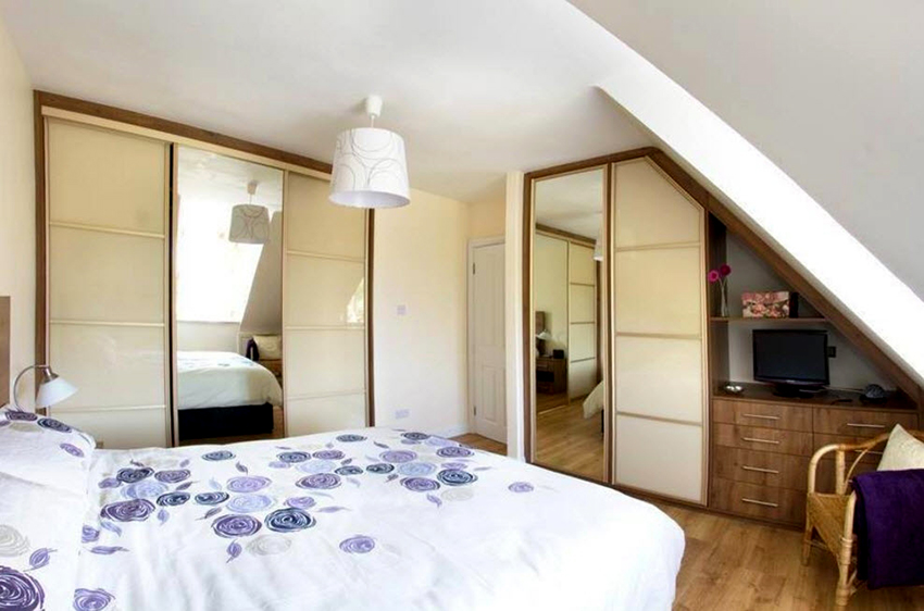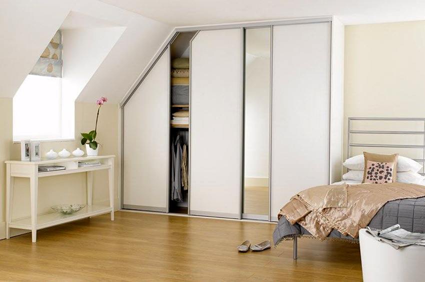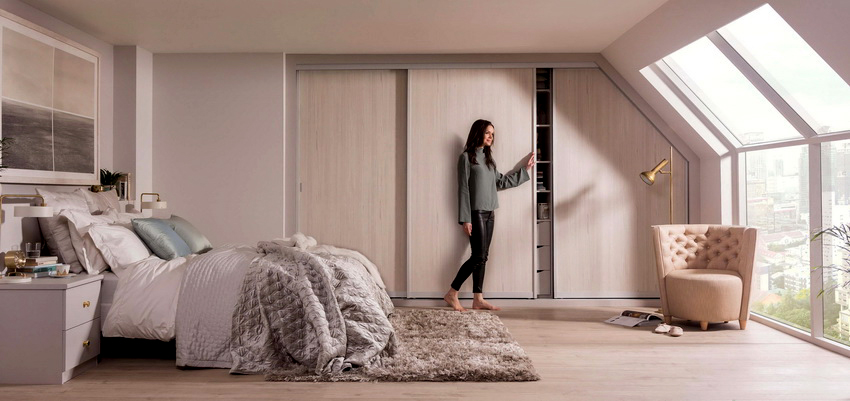 To organize a storage system under the stairs or in the attic, a built-in wardrobe under an inclined ceiling should be used. This design will eliminate broken corners and efficiently use the confined space. However, the manufacture of such a cabinet is a complex labor-consuming process that requires accurate calculations for every detail.