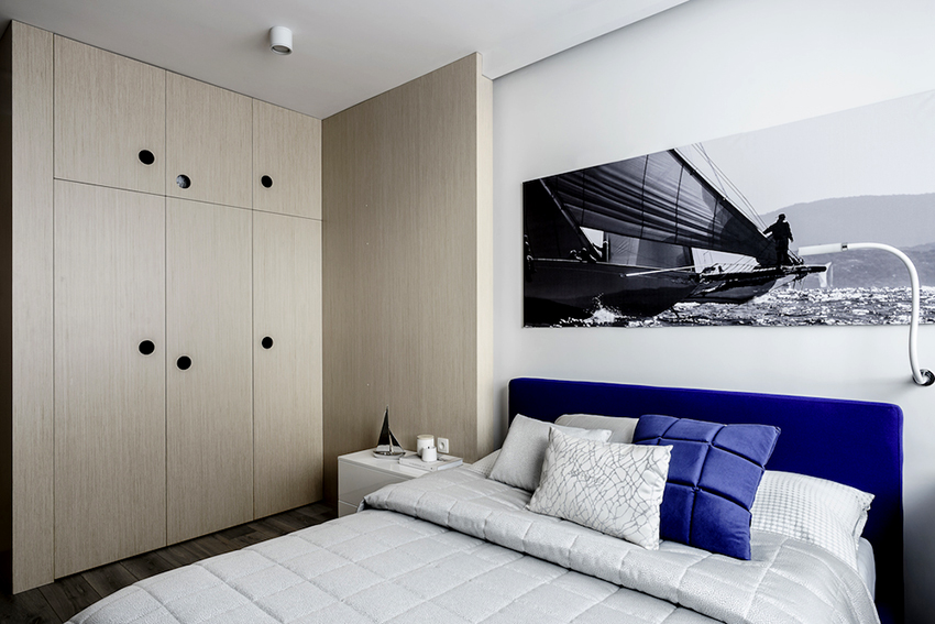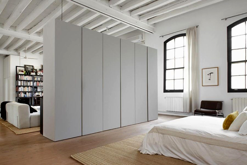 One of the configuration options for the built-in wardrobe is a model in which the walls of the room itself take on the role of the walls
