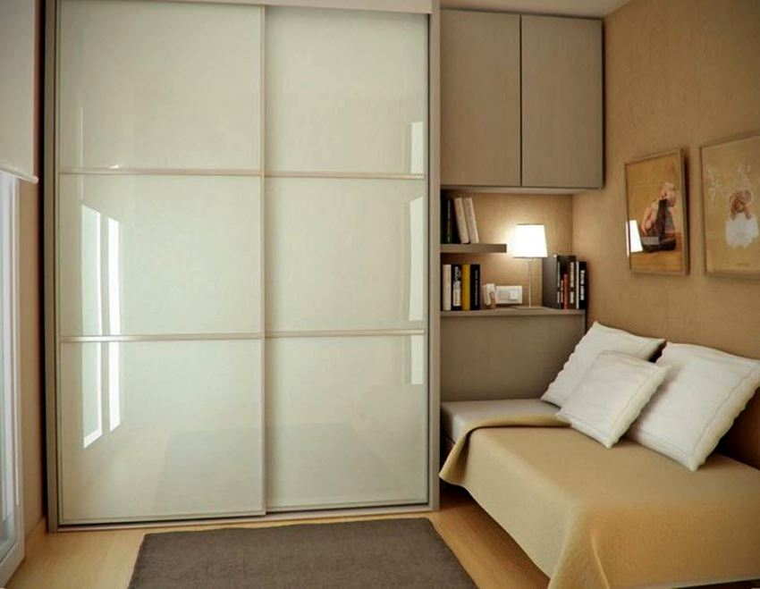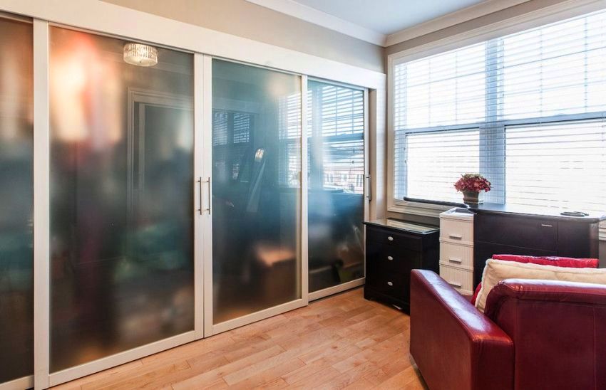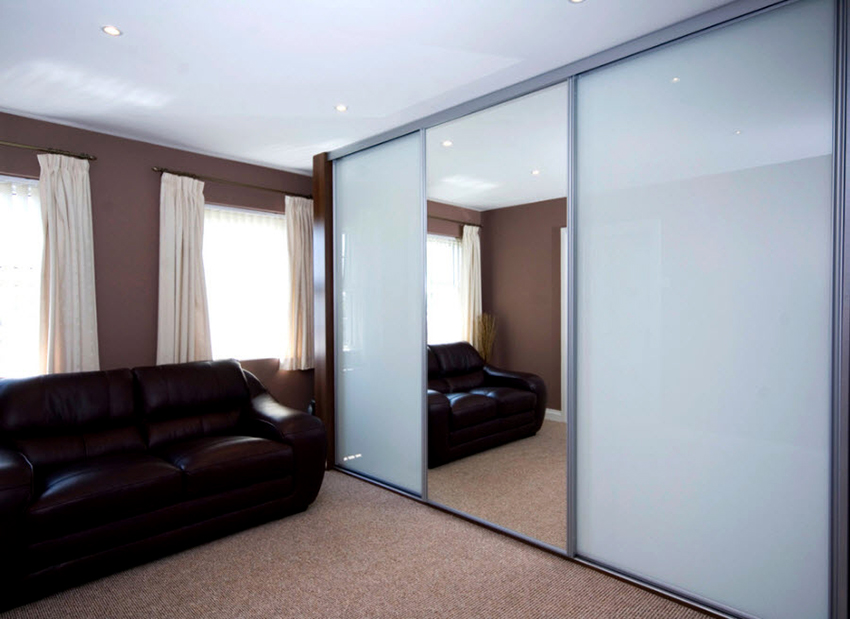 A sliding wardrobe with a frosted glass front is suitable for bedrooms and living rooms, decorated in any stylistic direction. Due to its discreet appearance and calm colors, the structure will fit favorably into a small room, visually increasing its space, which is clearly displayed in the photo of the cabinet in the living room.