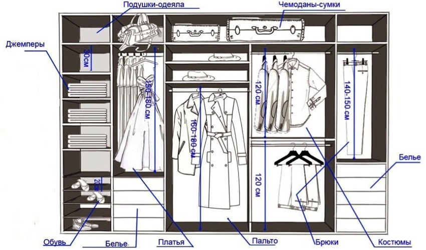 For the most effective use of the wardrobe, it is important to rationally use every centimeter of the interior space, which must be properly planned. The construction area is conventionally divided into three zones: upper, middle and lower, which is clearly shown in the wardrobe diagram.The top compartment is convenient for storing seasonal items and other rarely used wardrobe items.