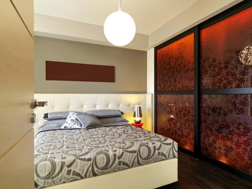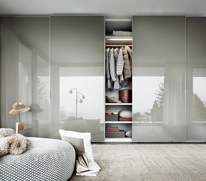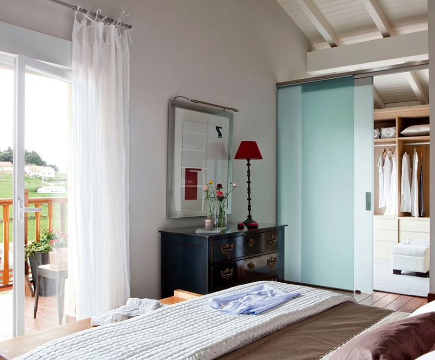 Sandblasted glass fronts of sliding wardrobes not only look great, but also bring some freshness and lightness to the interior