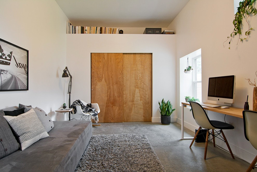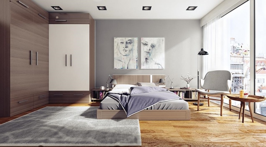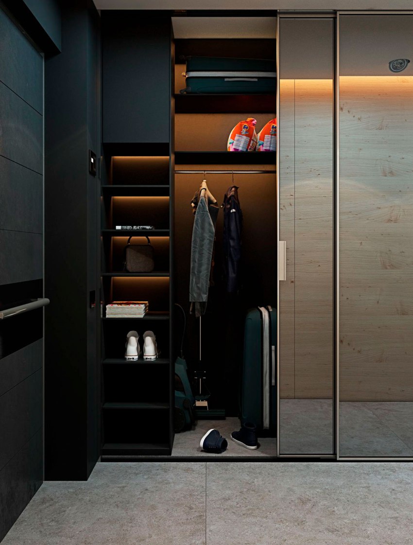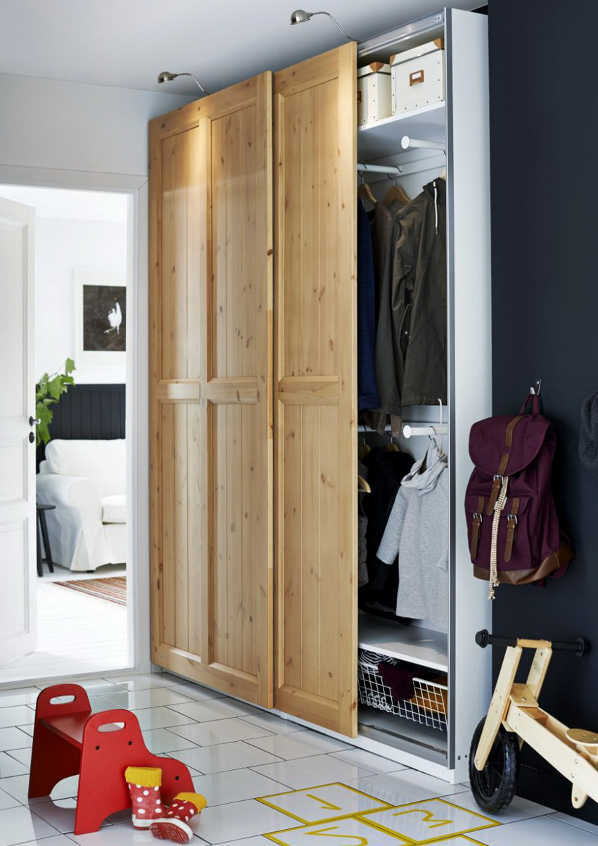 In the living room, the wardrobe - the photos clearly reflect this - it is advisable to equip open shelves where you can place books, beautiful dishes, souvenirs and photo frames. It is also recommended to organize storage space for sports equipment here.