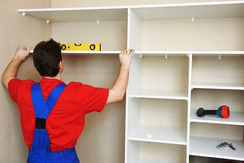 The installation of the cabinet begins with the assembly of the base. If the model is installed on adjustable legs, they should be used to level the horizontal level of the structure. Next, the vertical stiffeners of the cabinet are assembled, which are fixed to the base. The stability of the structure depends on their correct location. Then you should install cross-slabs, stationary shelves and attach the rods. The back wall is made of fiberboard. It is nailed to a rigid frame with nails.