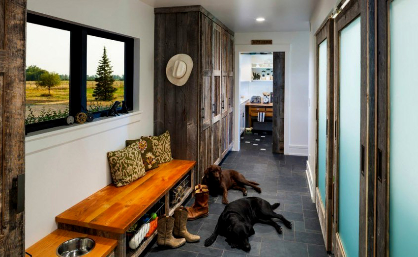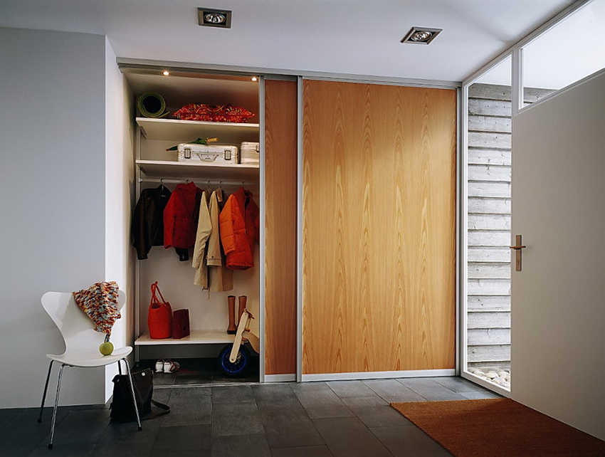 The single-sided design is represented by a wall-to-panel model. It is advisable to arrange this option in a room with a corner door. A two-door wardrobe with a mezzanine is convenient in the case of high ceilings in the apartment, when it is inappropriate to install too high doors. The mezzanine can be used to store things that are rarely used.
