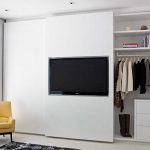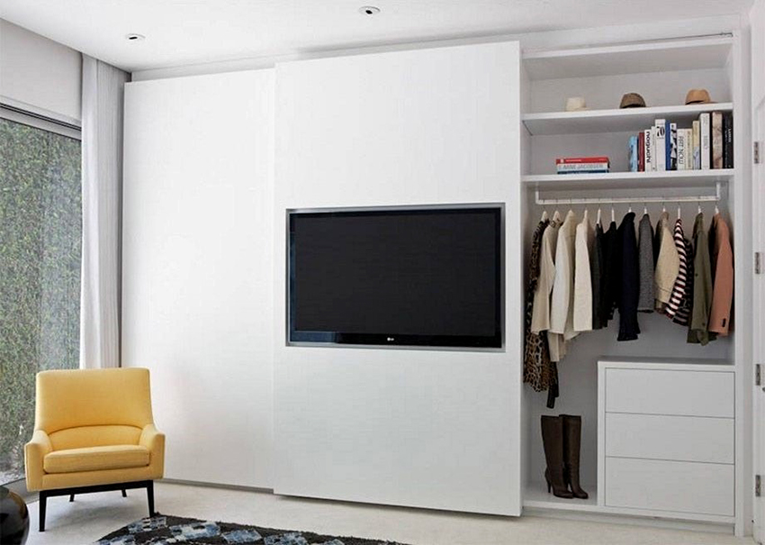 Useful advice! In the wardrobe in the room, you can hide a folding ironing board, dressing table, radio and television equipment.