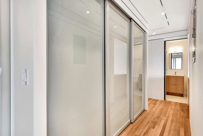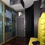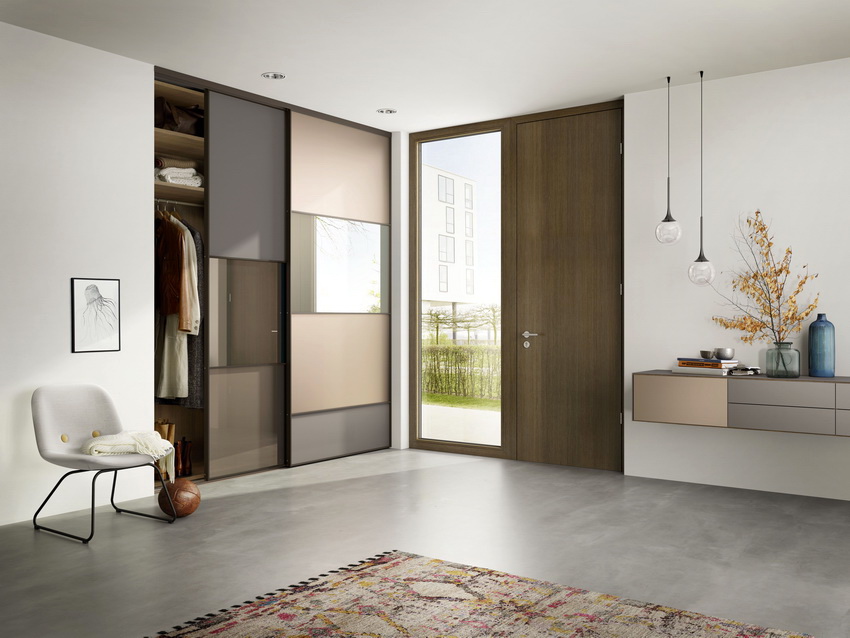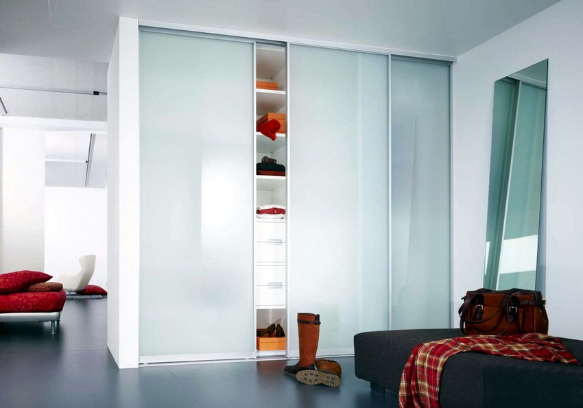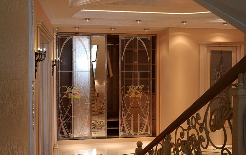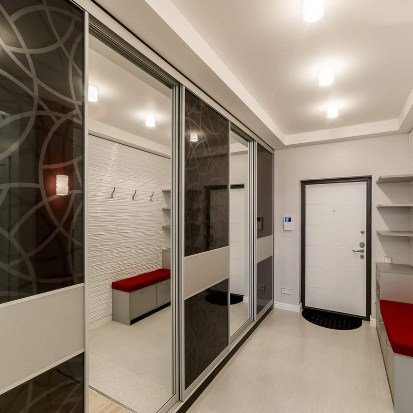 Often in the corridor you can find a structure with a glass facade. In this case, a matte material is often used, which allows you to achieve the effect of translucency, protecting the inner filling from prying eyes, and at the same time visually increase the size of the room. So you can arrange a built-in wardrobe in a small hallway. In addition, transparent glass is used, on the reverse side of which a decorative PVC film is attached with special additives that increase the strength and durability of the structure. Such a glass facade can be monochromatic, multi-colored or with various abstract and mosaic patterns.