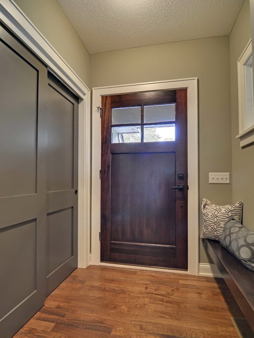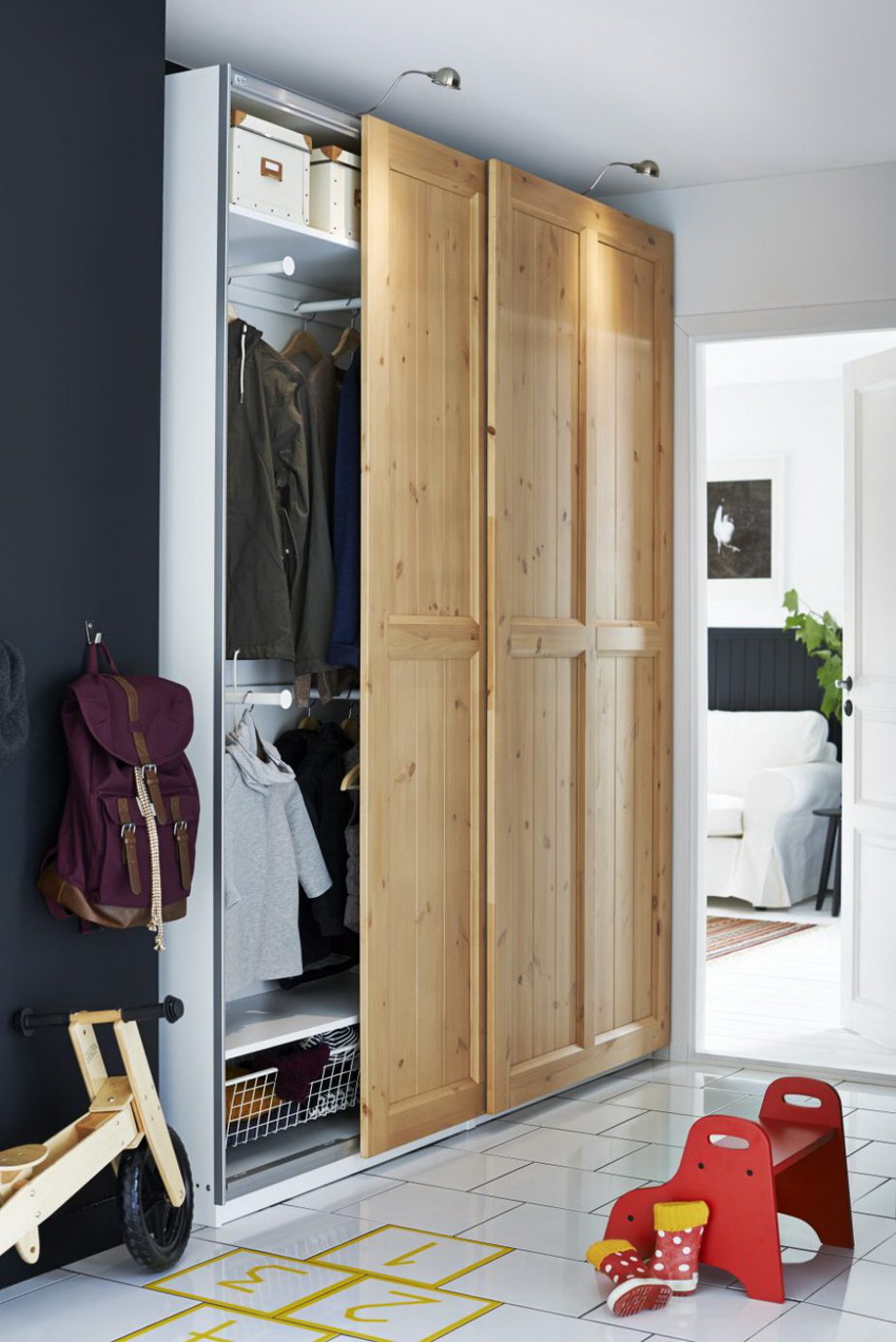 Plywood is a multi-layer wood material consisting of veneer sheets glued together. The surface can be laminated, varnished or painted. This material can be combined with other options, due to which it will be possible to obtain an attractive design of the wardrobe in the hallway. Photos clearly display various design ideas.
