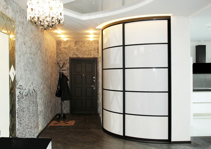 The most difficult and expensive to implement are radius wardrobes, in which the movement of the doors is carried out along the radius of the circle. The facade of such structures is made of expensive materials using a special technology, which significantly increases the price of a wardrobe built into the hallway. However, this is offset by a spectacular, stylish, original and unique appearance. This model is able to fit into any layout due to the ergonomic door opening. The disadvantage of the cabinet is the inability to use mirrors and chipboard in the manufacture of doors.
