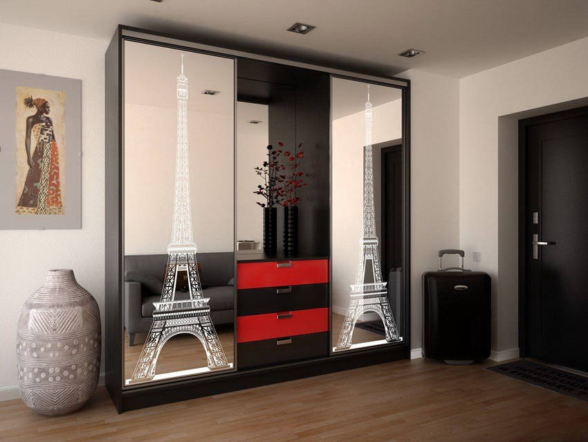 Prints on all doors are very popular, which are combined into a single composition in the closed position. During their movement, the image becomes three-dimensional. This effect is clearly demonstrated in the photo of the built-in wardrobes in the hallway.