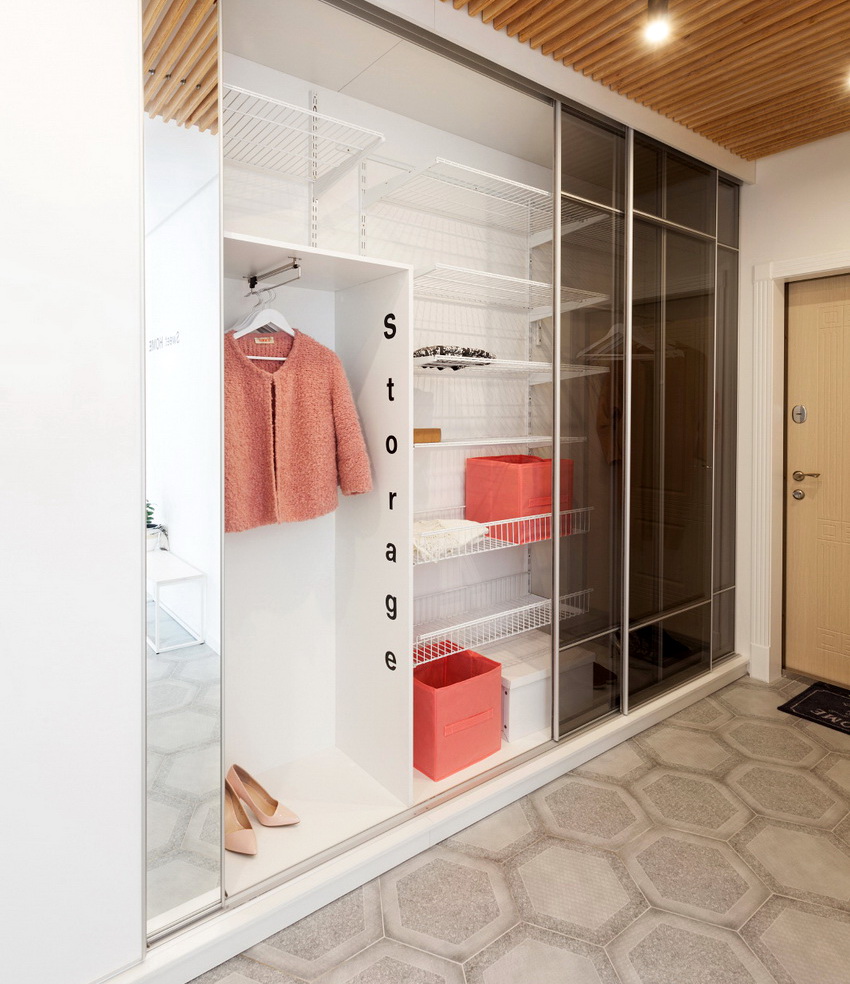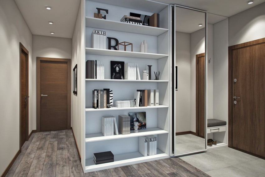 Very often you can find in hallway an open-type cabinet built into a niche, which is devoid of opening doors. This option looks minimalistic, but it is the most convenient to use, as it allows you to quickly remove clothes from the hook or take the necessary accessory from a shelf or drawer. However, since all the contents of the structure are in plain sight, things in the closet must be neatly arranged so that the room does not resemble chaos.