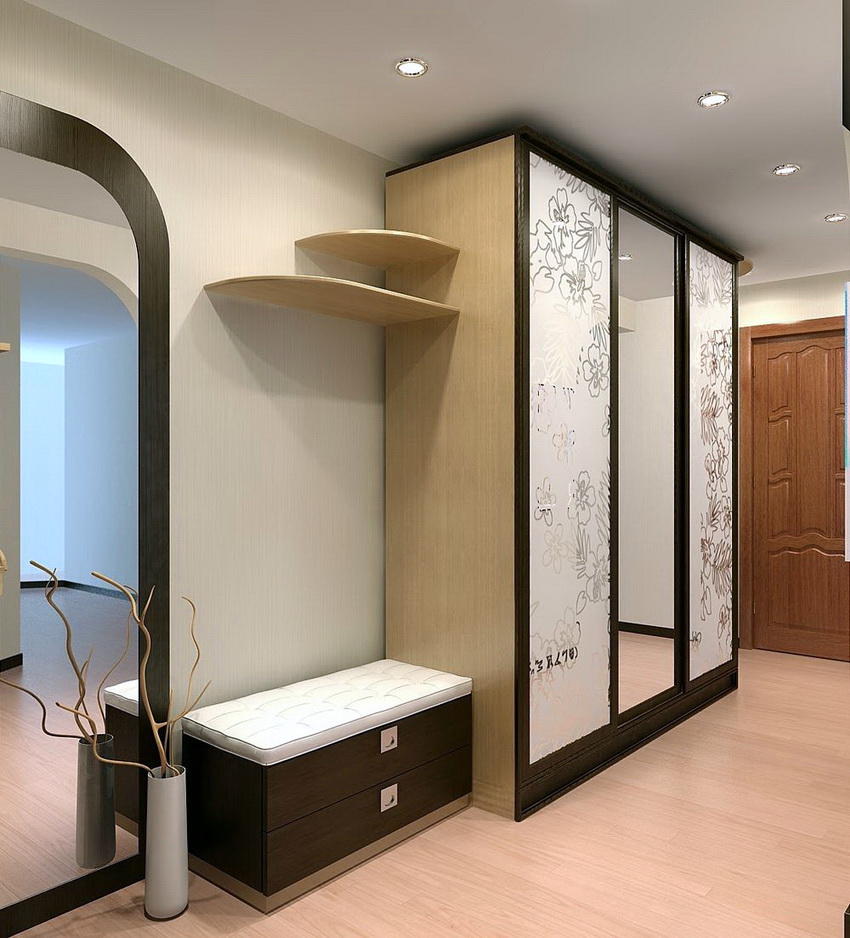 Sliding wardrobe in the hallway: photo modelher with mirrored, glass and plastic facades