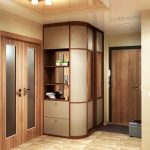 The corner wardrobe built into the hallway consists of elements of internal filling and sliding doors. A variation of the corner model is a trapezoidal structure, which is additionally equipped with side edges. Such a cabinet is more spacious than a simple triangular counterpart. The outer sides of the structure can be equipped with open shelves to accommodate various small items.