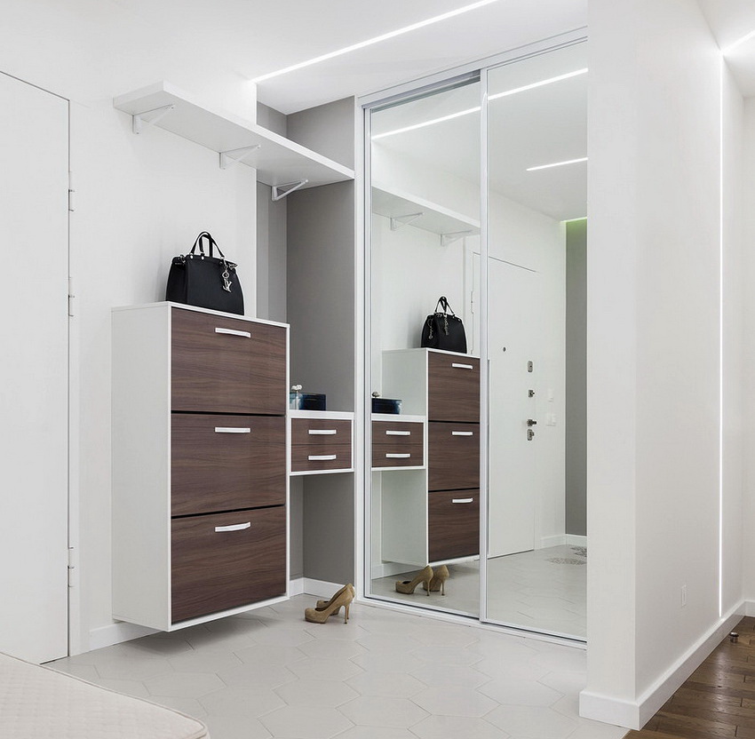 Outerwear is stored exclusively on hangers, so most of the internal space is allocated under a niche with a bar. If the closet is narrow double-winged, then both compartments are occupied by hanging clothes. Shelves can be located at the top and bottom of the structure. In the case of a three-piece wardrobe, one compartment is used for stationary or sliding shelves, which is clearly visible in the photo of sliding wardrobes in the corridor.