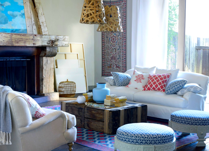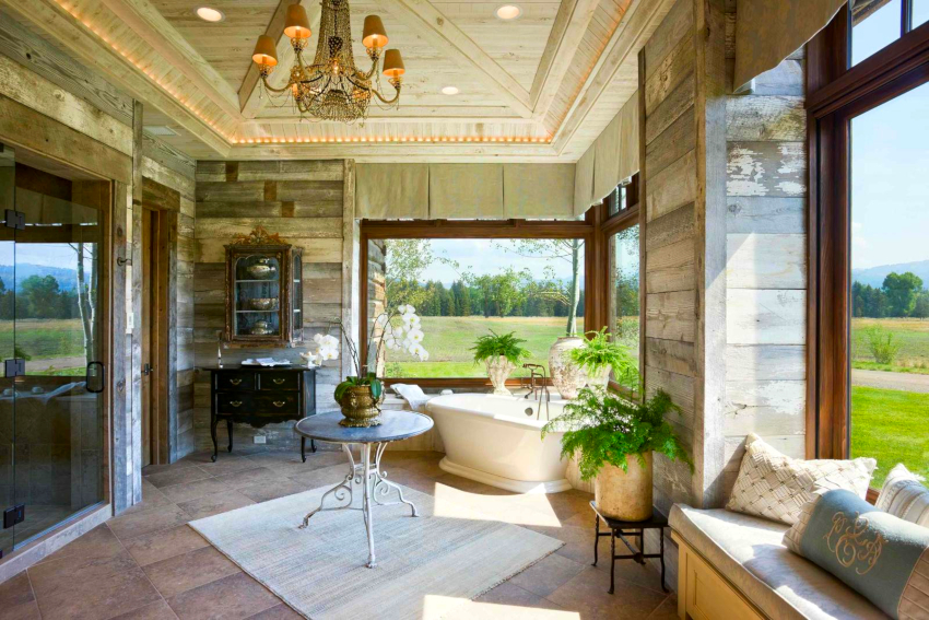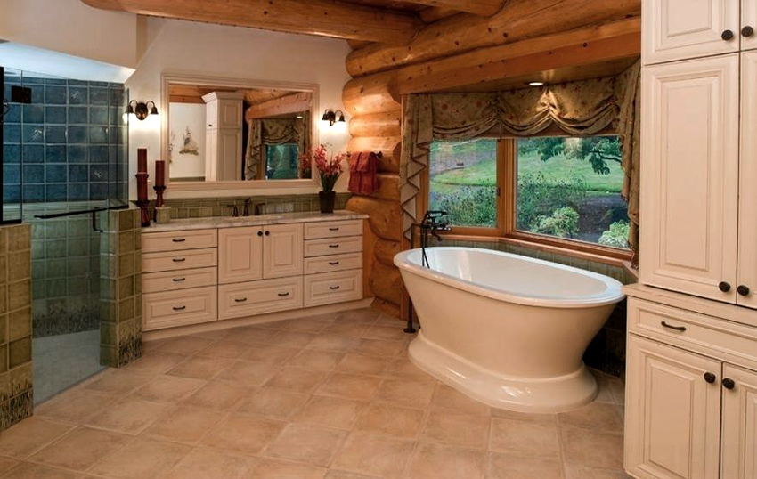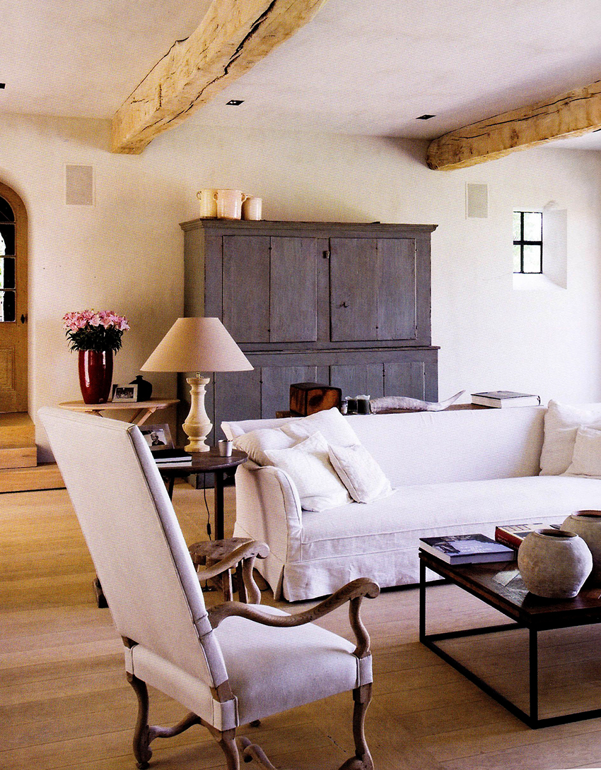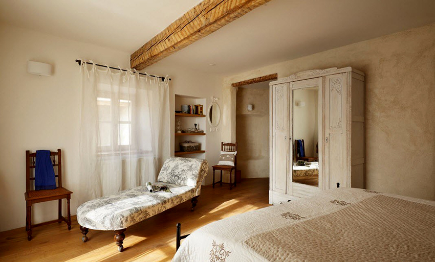 Provence style wardrobes and sofas are successfully combined with wooden beams on the ceiling, walls and fireplace
