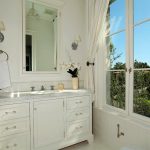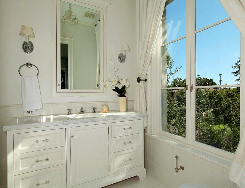Provence style cabinets require a certain amount of space, so their placement is permissible in spacious rooms, where all the necessary appliances and plumbing have already been installed and there is free space. If the area is not enough, then a corner cabinet would be an excellent option. The dominant color is white, which, in addition to style, goes well with sanitary ware and is associated with freshness and cleanliness.