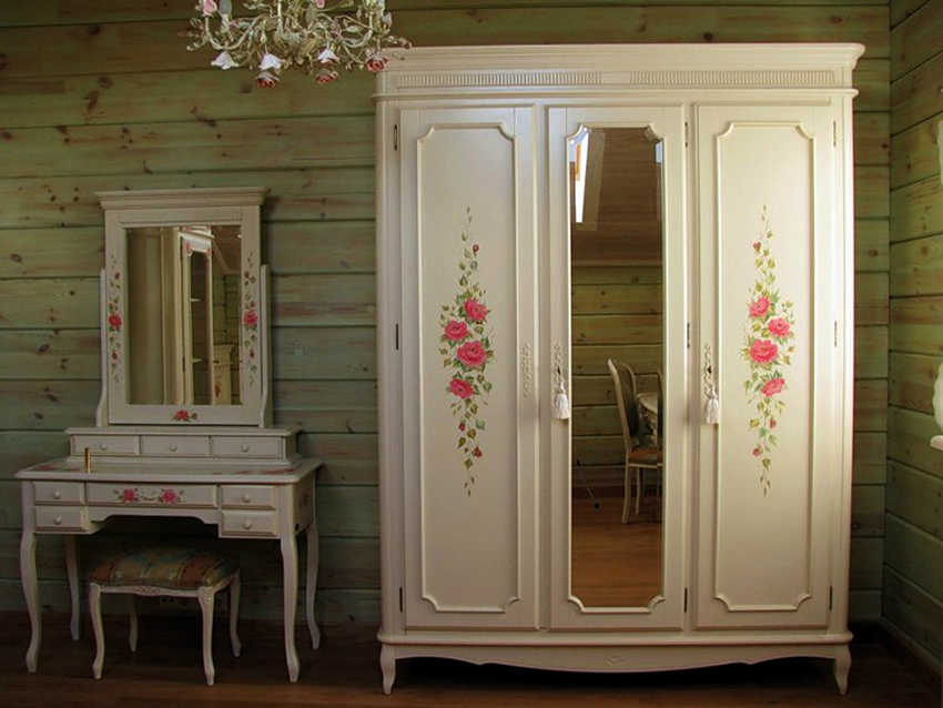 The facade of the Provence-style wardrobe is equipped with one or two large mirrors with decorative painting