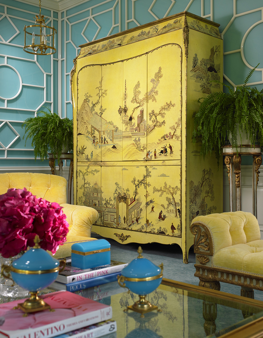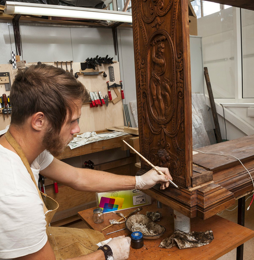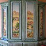 After cleaning the surface and restoring the fittings, they start painting and decorating the cabinet