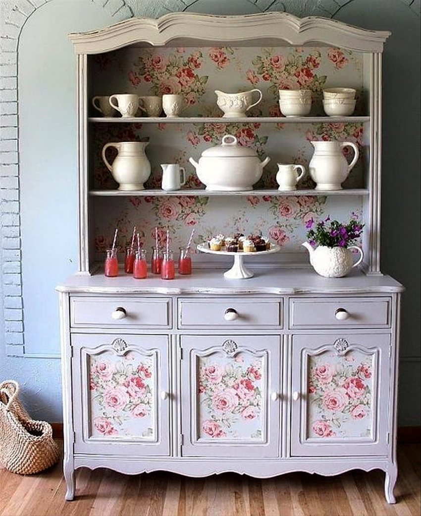 Decoupage will allow you to create an original decor. It is carried out by hand using paper pictures with various images and compositions, which cover the facades in whole or in part. In French country, small floral patterns are preferred. Only abstraction will be out of place here.
