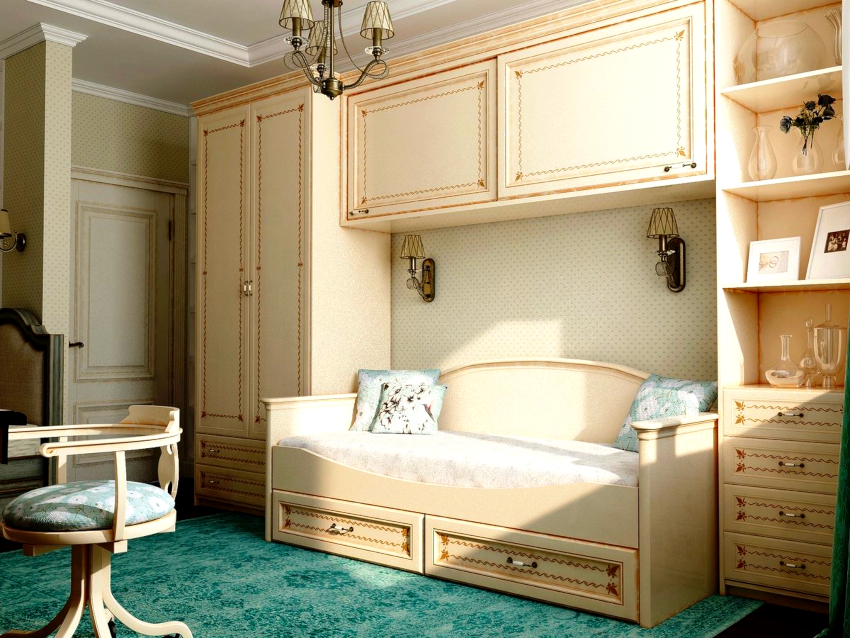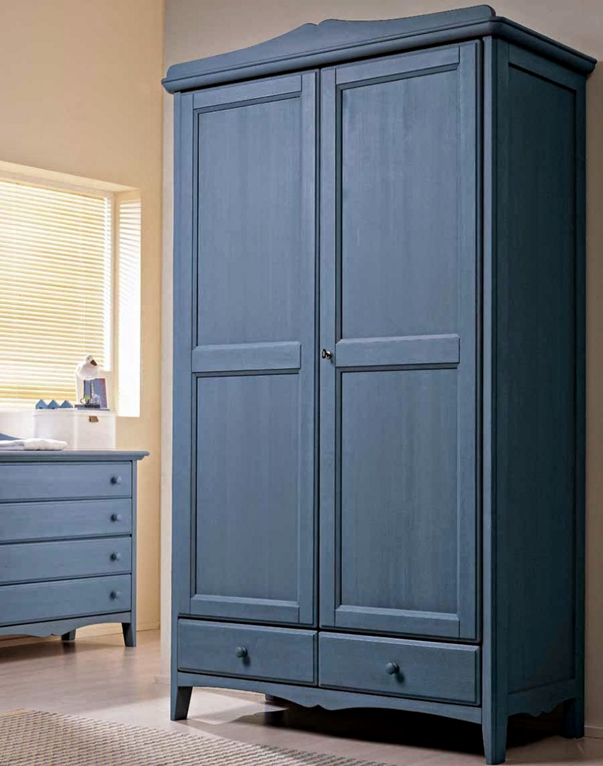 Stricter forms in carving and decoupage are used as decor for boys' rooms, and blue, green shades, as well as light brown and olive colors are used for painting. Besides the fact that such cabinets have a very attractive appearance, they are distinguished by their spaciousness and functionality. Rationally positioned shelves for clothes and shoes, a compartment with a bar for tremples, as well as boxes for storing bed linen located at the very bottom help to ensure this in full.