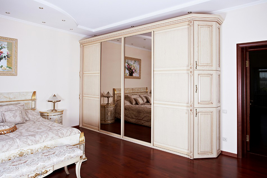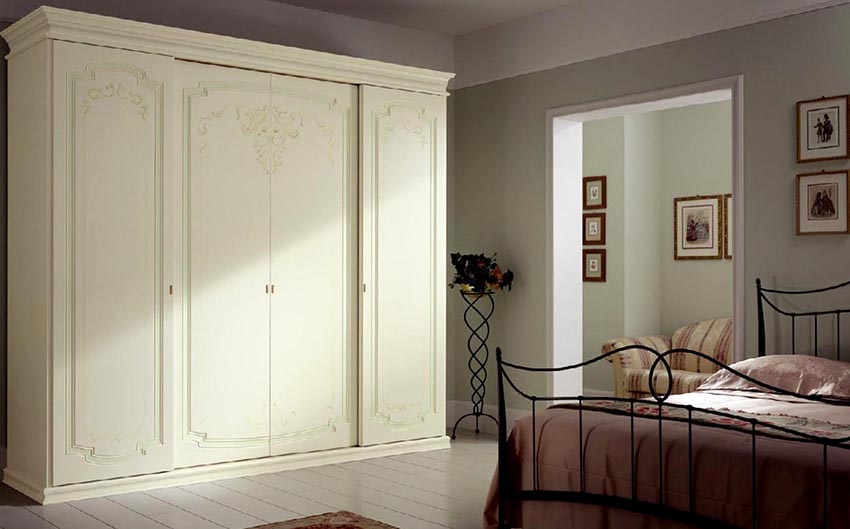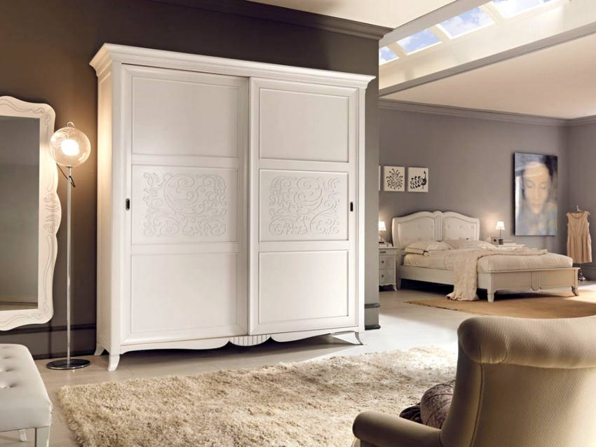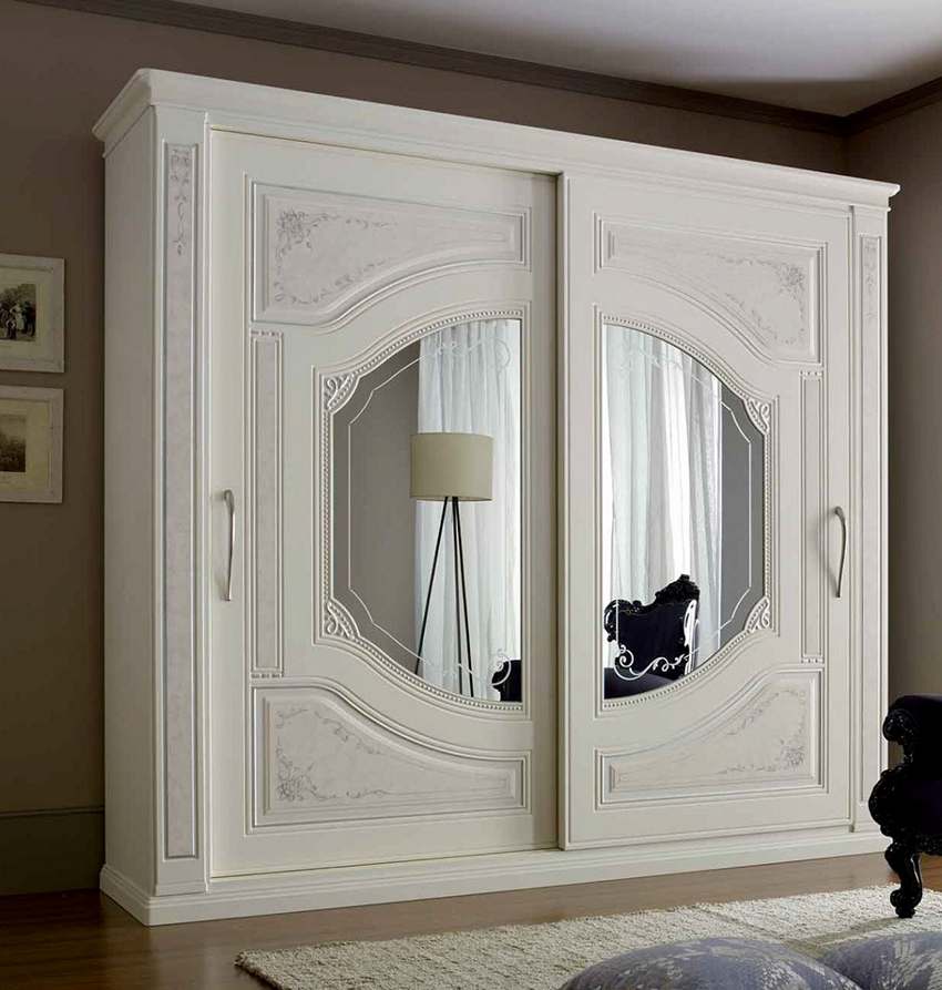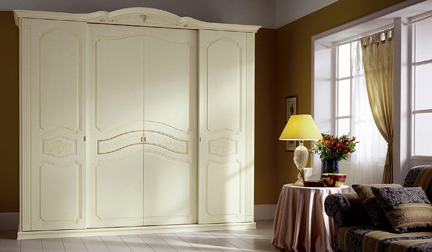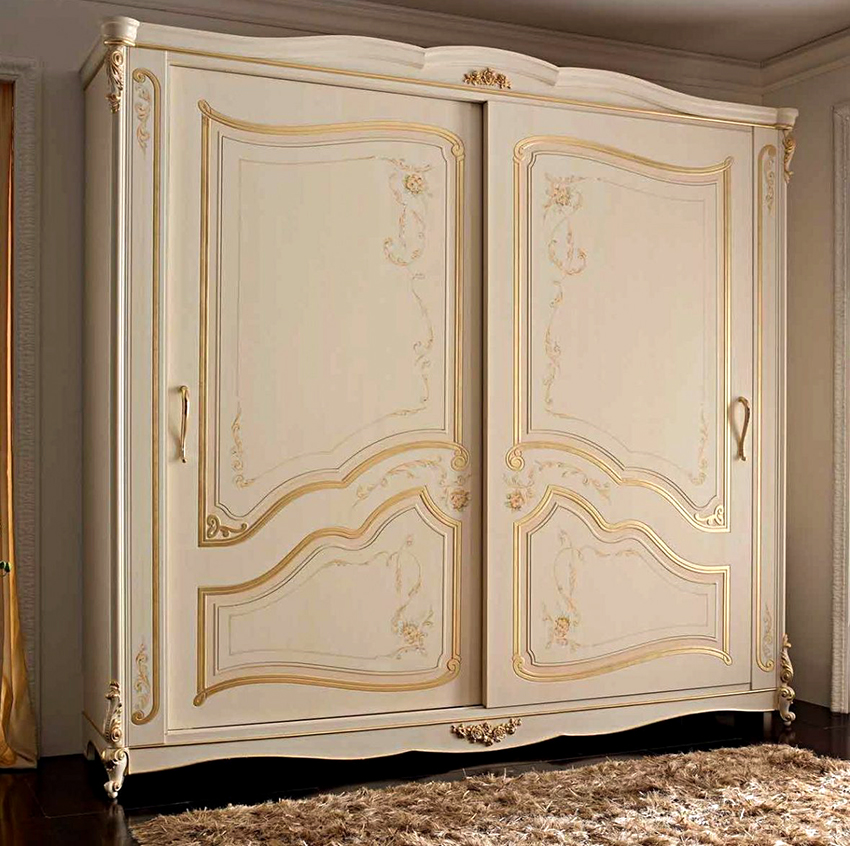 A number of products can be decorated with handmade carvings or other wavy elements. It is on the wardrobe structures that the cabinet decor is most often applied with their own hands. Exclusive batches are hand rubbed in three layers to create a unique color scheme for each model. In the production of fittings, only bronze or copper is used. Stencil painting, which is applied to the craquelure surface of the door, contributes to the sophistication of the furniture. A white Provence wardrobe looks especially romantic in the bedroom.