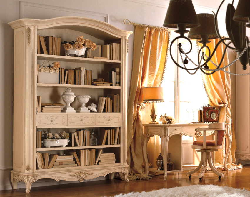 Provence bookcases are made from natural wood. They look solid, soundly, equipped with open and closed shelves. Most of the models are combined, they have partial glazing. This helps to quickly find the necessary book or documents, and the glass protects against dust.