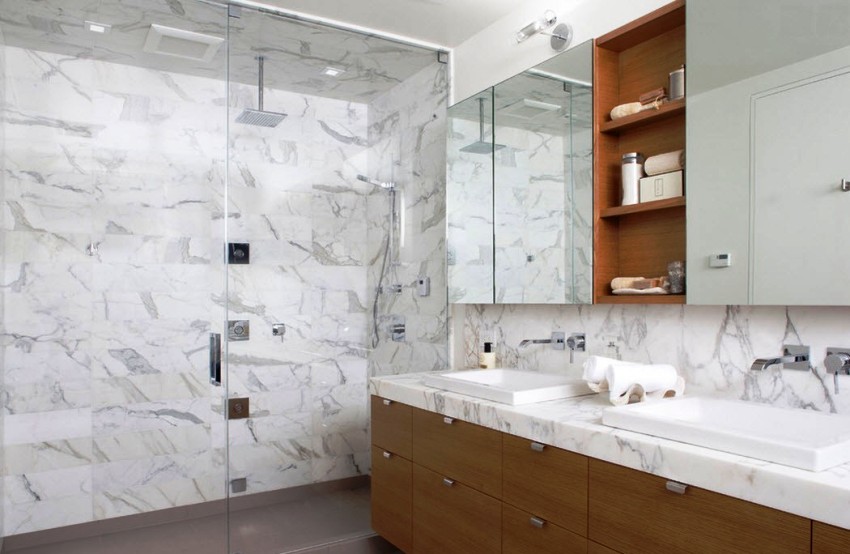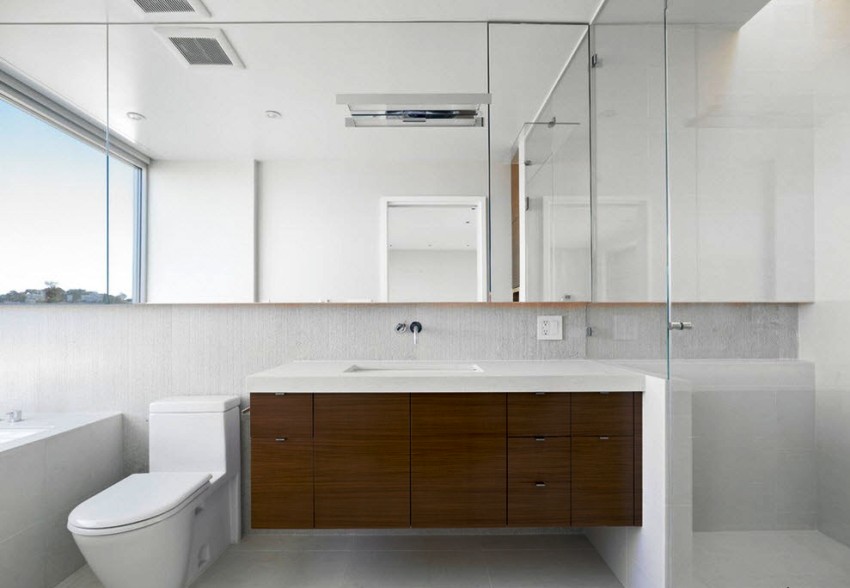 If you have chosen to install the shelves, you can leave them open or close them. Closed shelves require additional doors, which make the structure heavier and require additional space for free movement. Most designers are inclined to believe that it is better to close the shelves, as a result of which the cabinets will look more aesthetically pleasing and allow you to hide some of the clutter on the shelves. Other types of sanitary doors to the toilet: