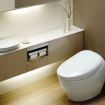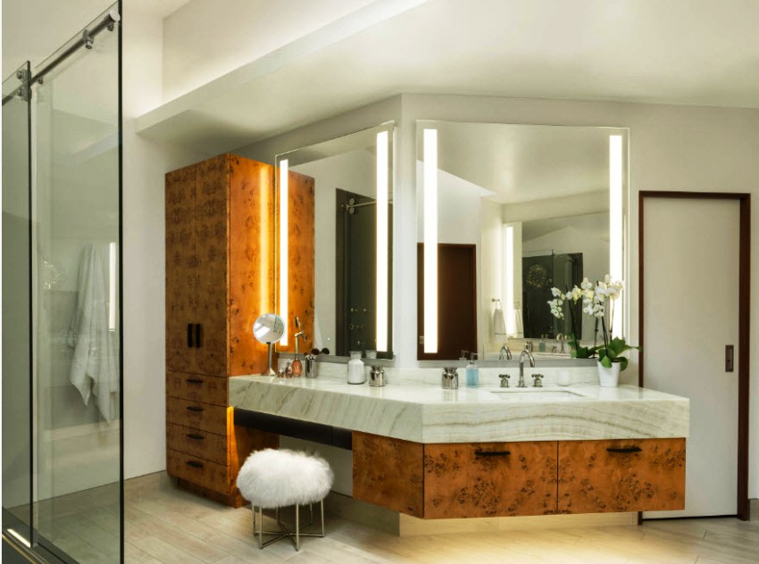Cabinet lighting. In many photos of built-in closets in the toilet behind the toilet, you can see that the lighting is used both on the doors and inside the closet. Such a function will allow not only to fill the room with additional light, but also help to save time searching for the necessary items on the shelves without turning on the main light.