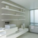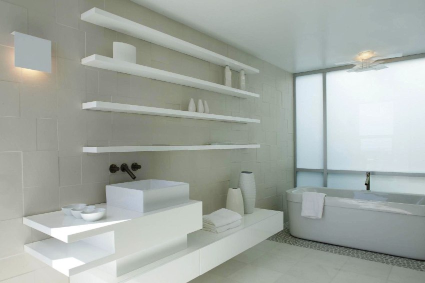 In a small room, a good solution for the rational organization of the area will be the installation of several corner shelves, with which you can intelligently use unclaimed corners. In this case, you can not only install open shelves in one corner, but also use all the free space. However, most often corner shelves are placed on both sides of the toilet, since there they will not interfere with anyone. In this case, a small cabinet will be optimally placed between the corner shelves, which performs a purely technical function that allows you to hide communications. If you make it a little larger, you can store tools or toiletries in it.