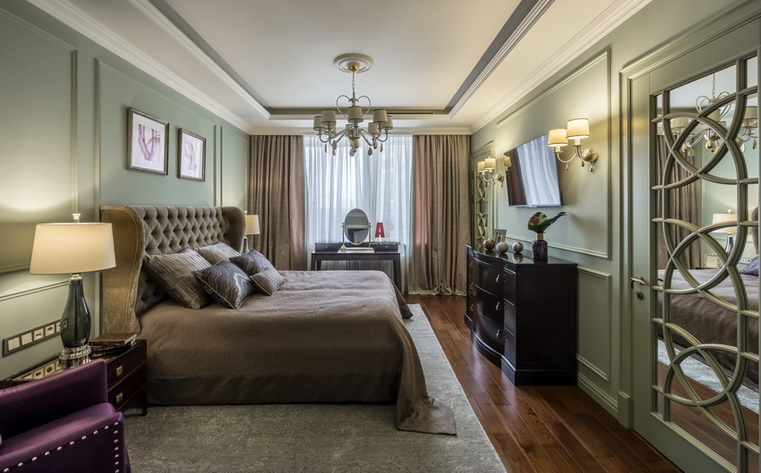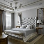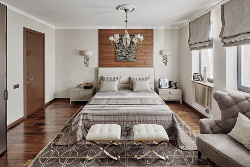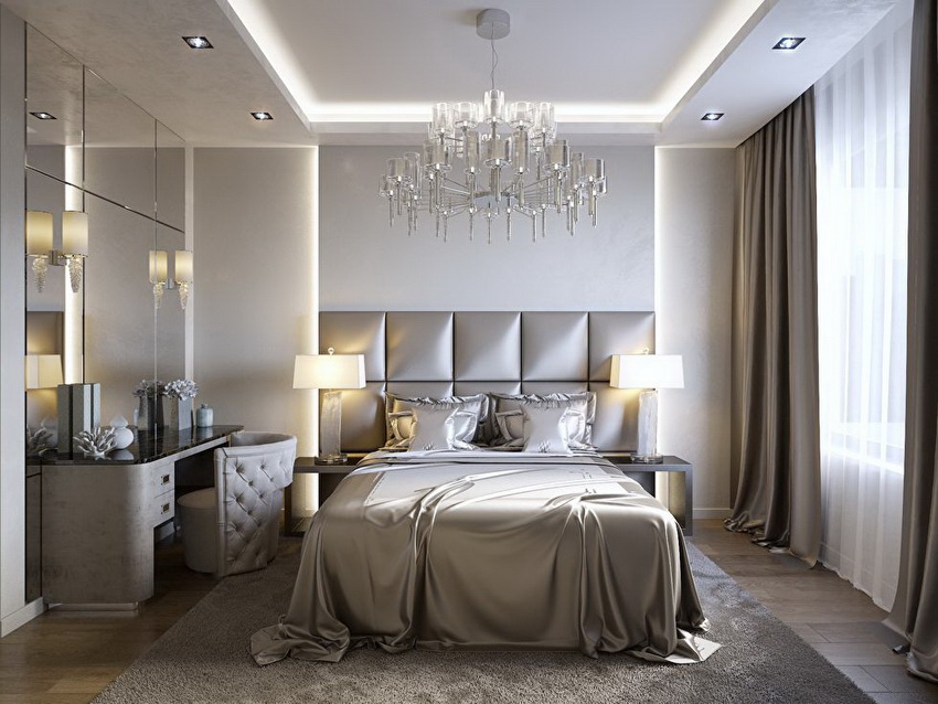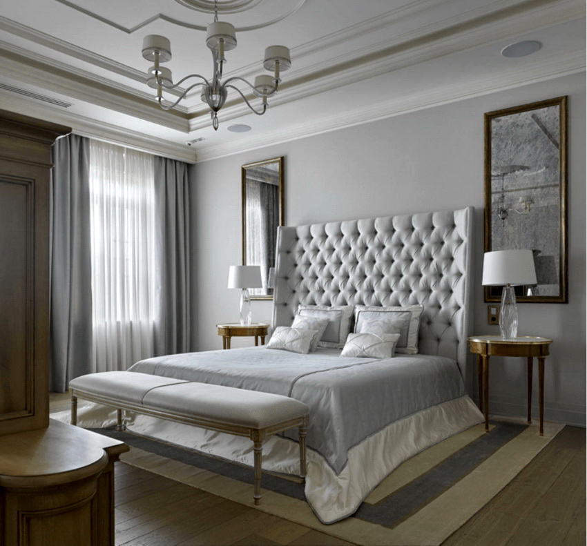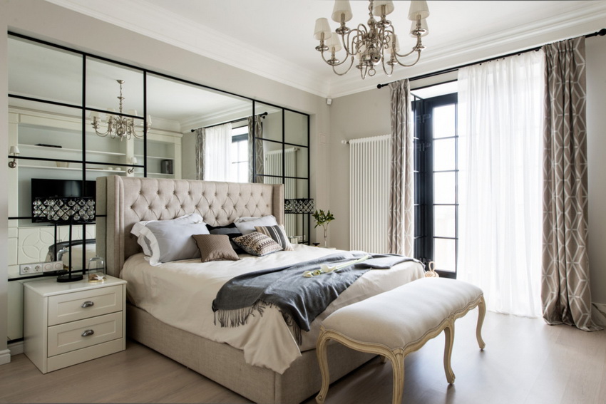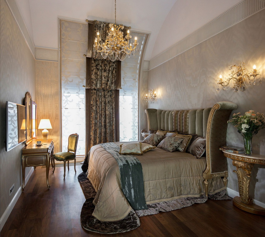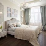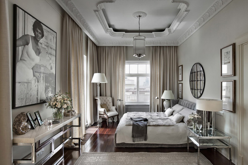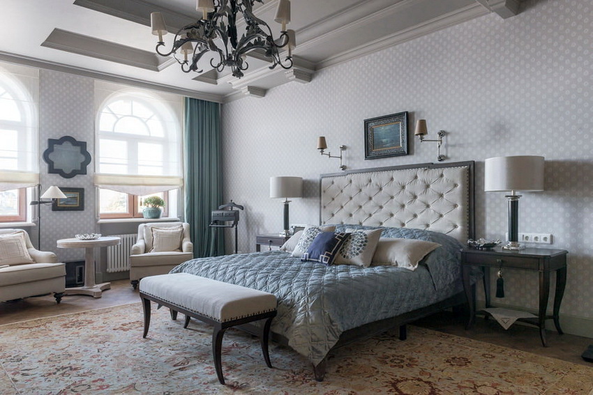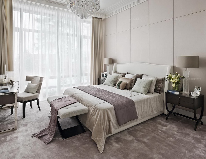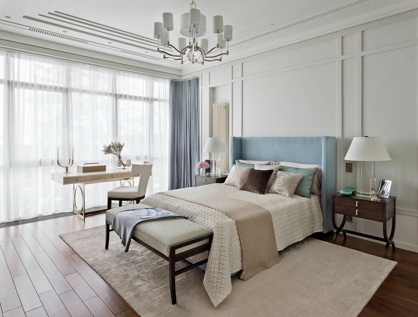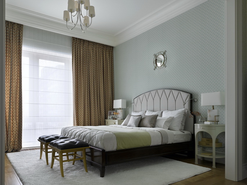 If the room seems too impersonal, you can put a small carpet with a clearly visible pattern by the bed, or choose a bedspread of a more saturated shade. Adherents of neoclassicism, suggesting a bedroom set made of massive furniture with carved legs and ornate patterns, heavy curtains, lampshades, should remember that the room where all this is supposed to be placed must have high ceilings and large enough window openings.