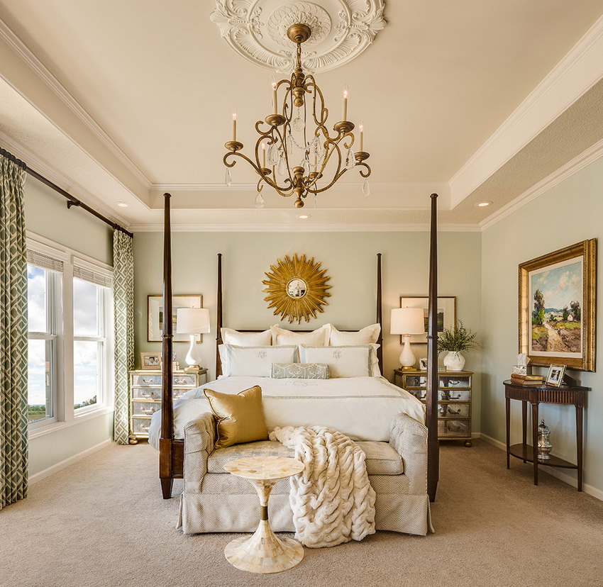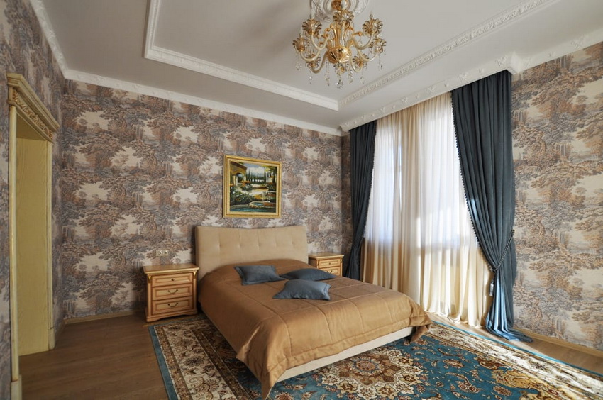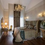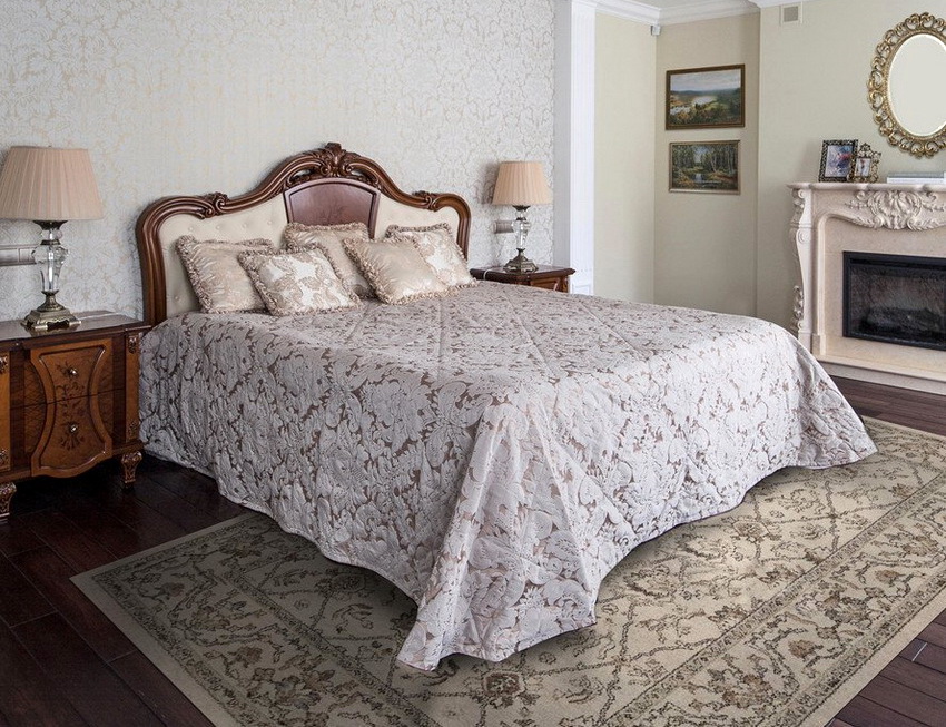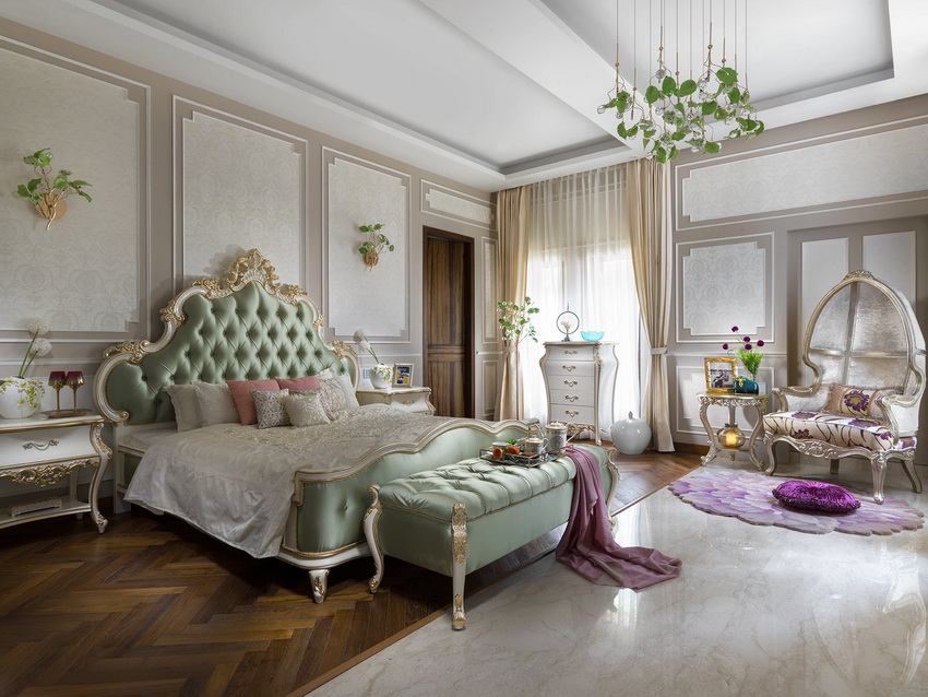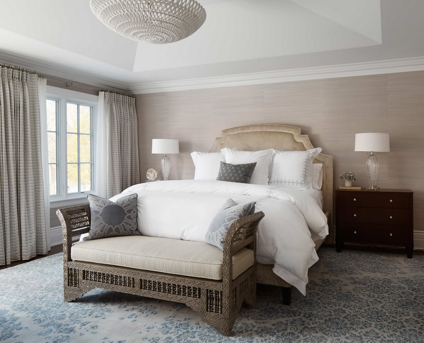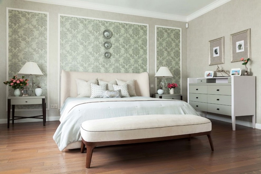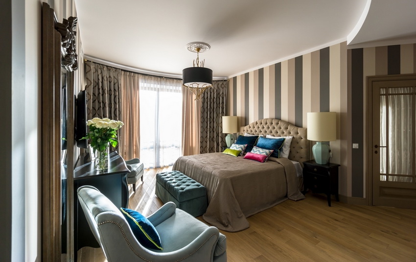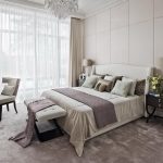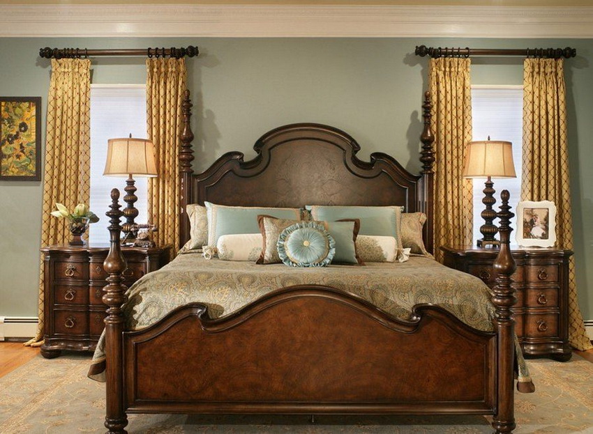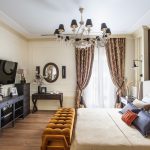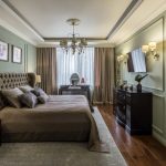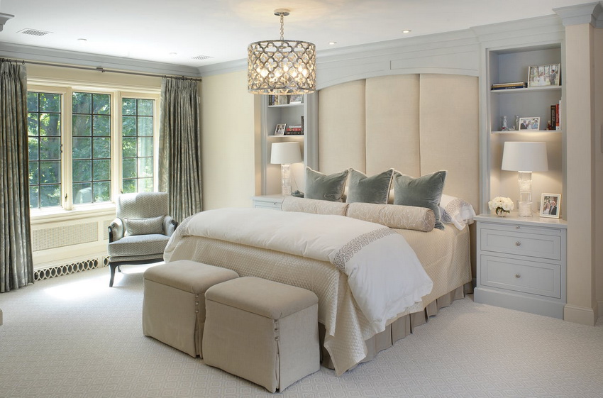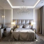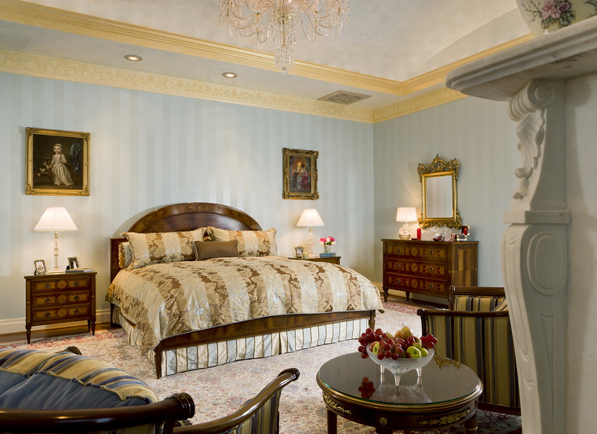 If the room seems too impersonal, you can put a small carpet with a clearly visible pattern by the bed, or choose a bedspread of a more saturated shade. Adherents of neoclassicism, suggesting a bedroom set made of massive furniture with carved legs and ornate patterns, heavy curtains, lampshades, should remember that the room where all this is supposed to be placed must have high ceilings and large enough window openings.