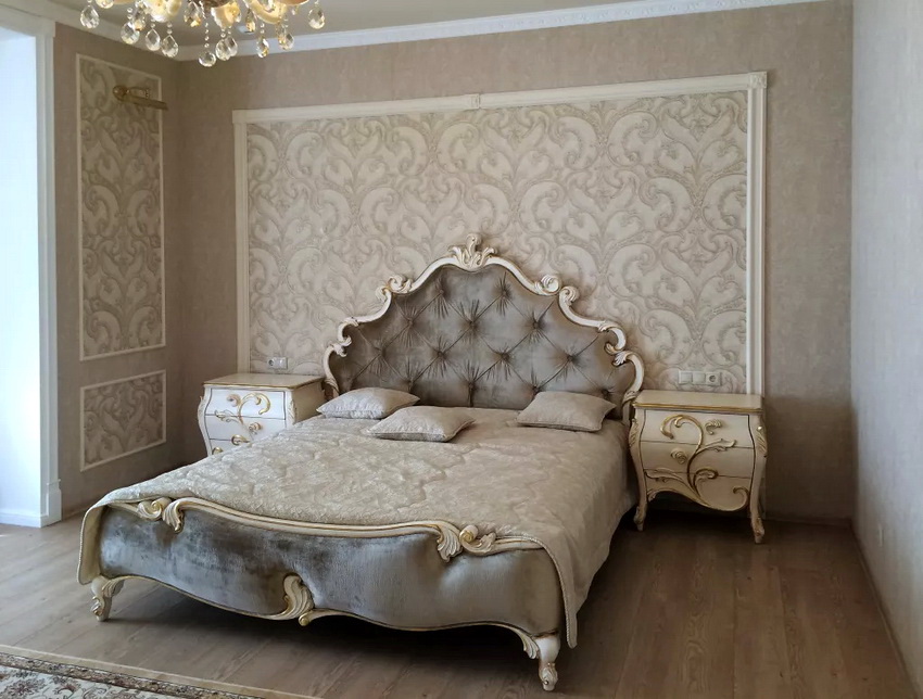 The method of processing wood materials has reached such a level that furniture of any aesthetic direction can be made from boards, even a bedroom set in a classic style. The designs imitated by wood with veneer are complemented with wooden details: legs, armrests, decorative elements in the form of carvings, frames, etc.